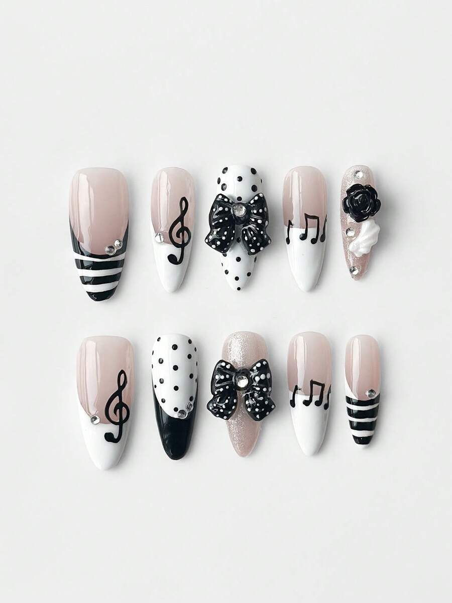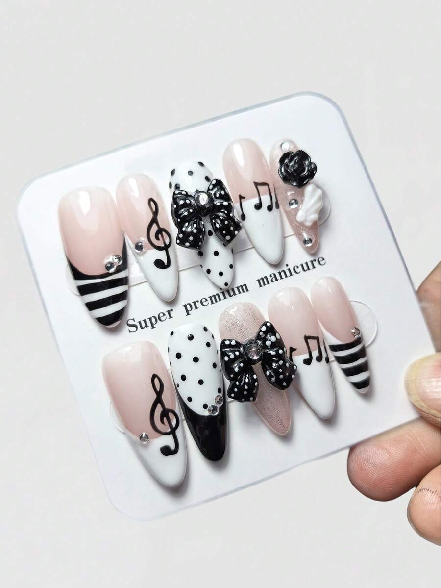 Anime 10 Cute Bow Music Note Polka Dot Elements High Quality Handmade Fake Nails + 3 Double-Sided Tape, Sweet French Style Sticker Diamond Glitter Black And White Polka Dots Removable Long Almond-Shaped Wearing Armor, Suitable For Holiday Parties, Dances And Daily Wear.