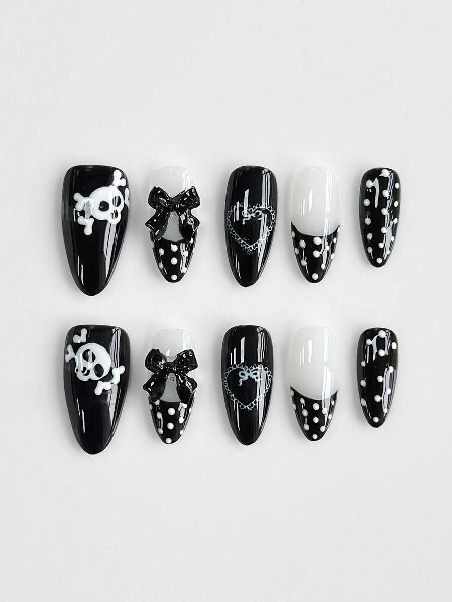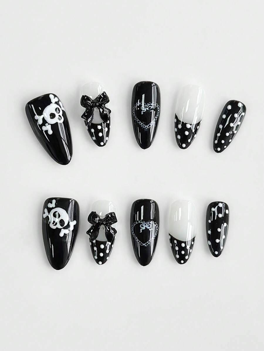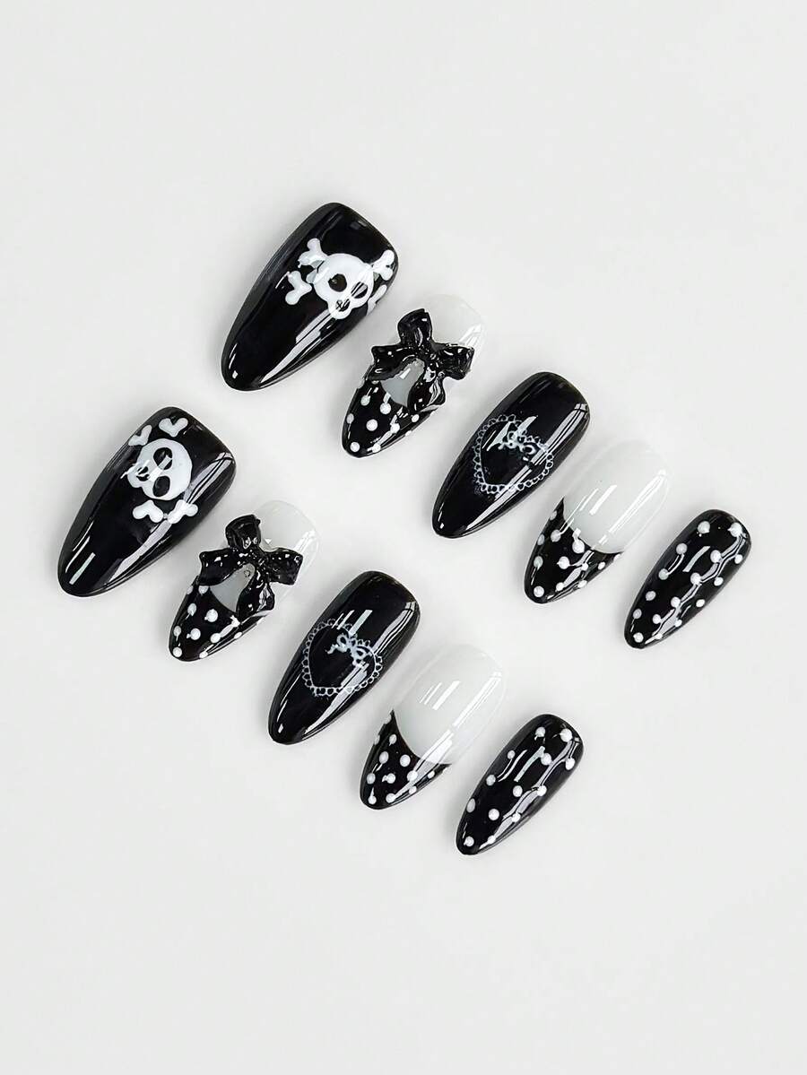 Anime 10pcs Cute Bowknot Music Note Star Element High Quality Handmade False Nails + 3pcs Double-Sided Adhesive, Y2K French Style Rhinestone Chain Polka Dot Removable Nail Art Stickers, Suitable For Holidays, Parties, Dancing And Daily Wear