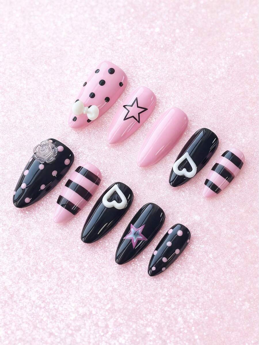 Anime 10pcs Cute Bowknot Music Note Star Element High Quality Handmade False Nails + 3pcs Double-Sided Adhesive, Y2K French Style Rhinestone Chain Polka Dot Removable Nail Art Stickers, Suitable For Holidays, Parties, Dancing And Daily Wear