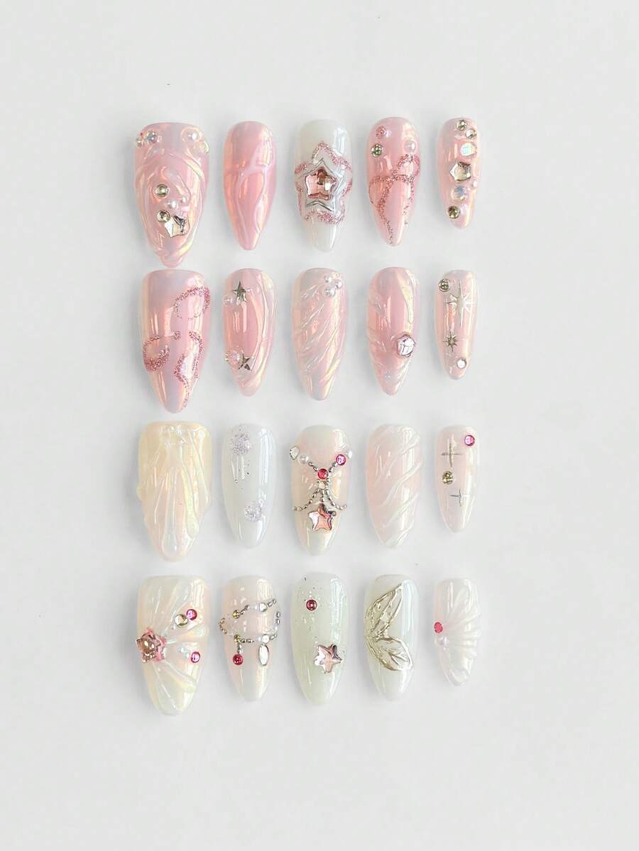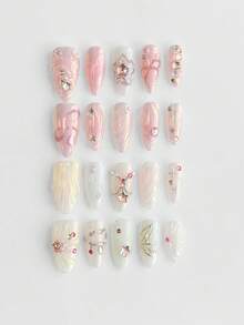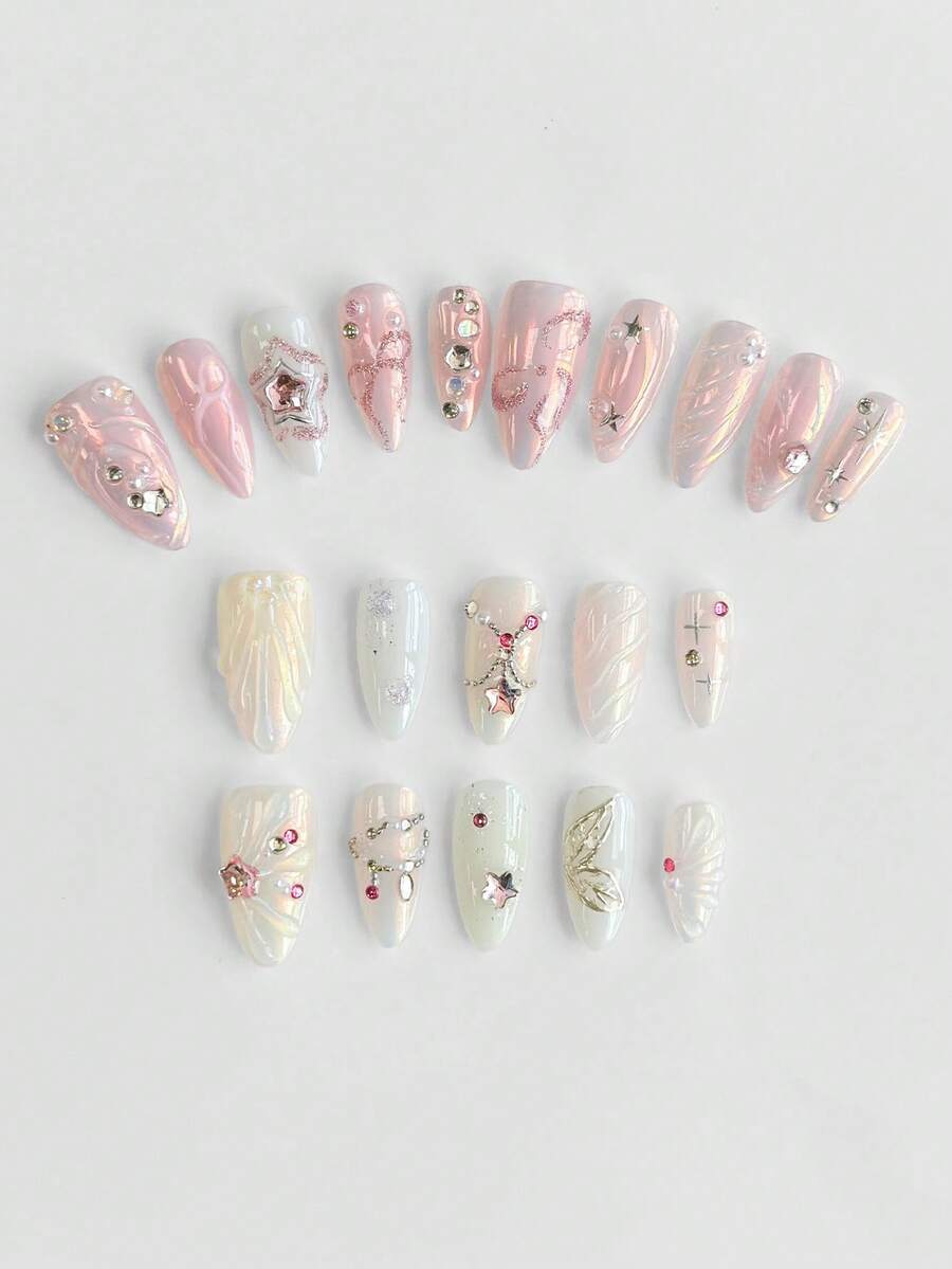 Anime 10pcs Cute Wings, Rose, Bow, Music Note, Star Element High Quality Handmade False Nails + 3pcs Double-Sided Adhesive, Y2K Style Rhinestone Pink Polka Dot White Lace Removable Manicure Stickers, Suitable For Holidays, Parties, Dancing And Daily Wear