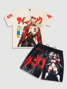 2-Piece Men's Anime Print Short Sleeve T-Shirt & Shorts Set, For Everyday Wear