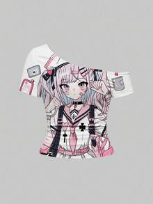 Cute Anime Girl Cross Design Sexy Asymmetrical Neck Y2K Anime Cartoon T-Shirt For Women