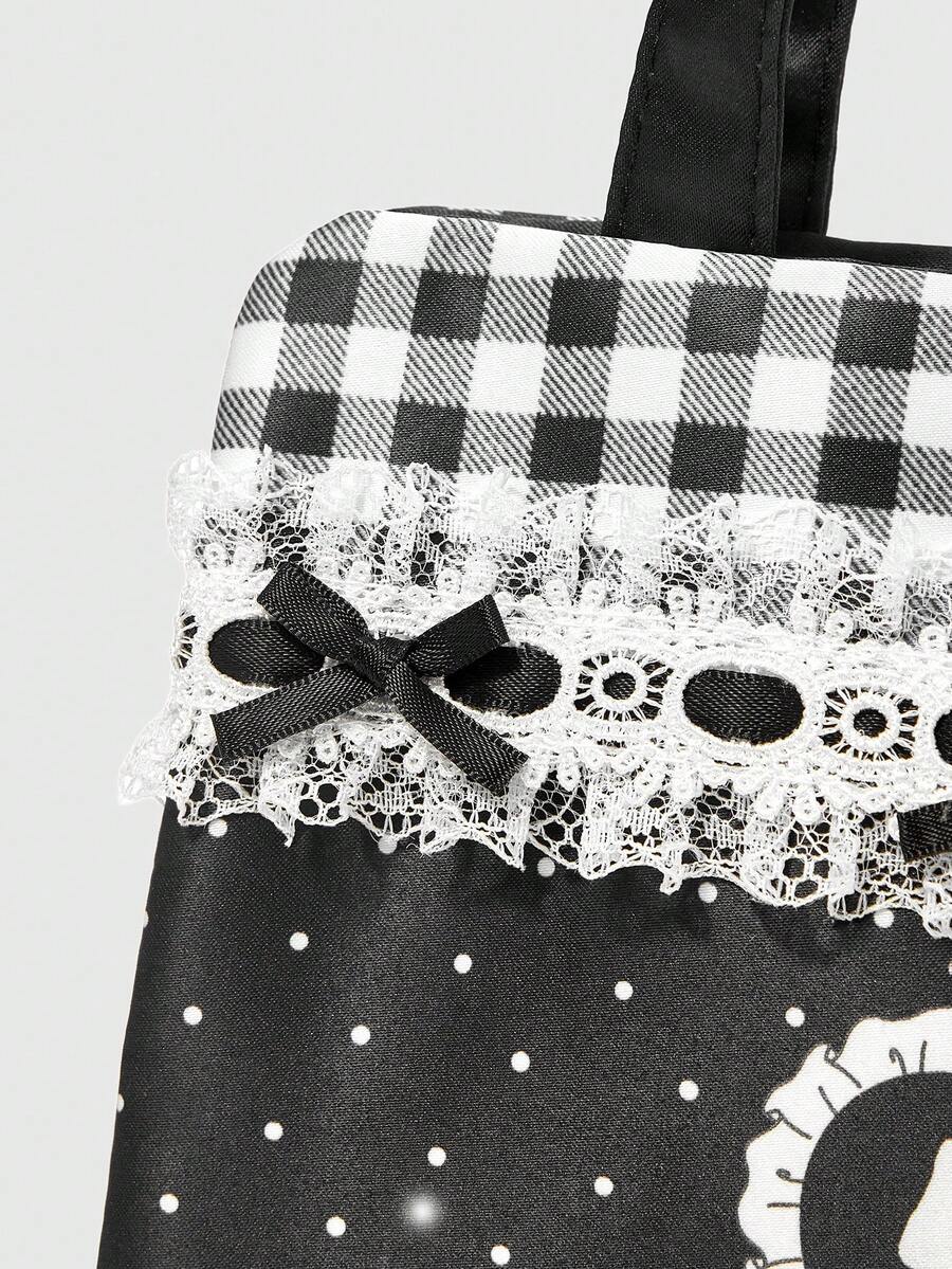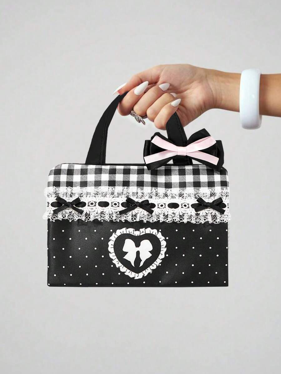 Anime Cute Teenage Girl Style Floral Lace & Plaid Patchwork Bow Pattern Large Capacity Portable Cosmetic Organizer Makeup Bag 401422