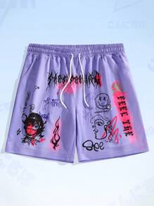 Anime Guys Cartoon & Letter Graphic Drawstring Waist Shorts