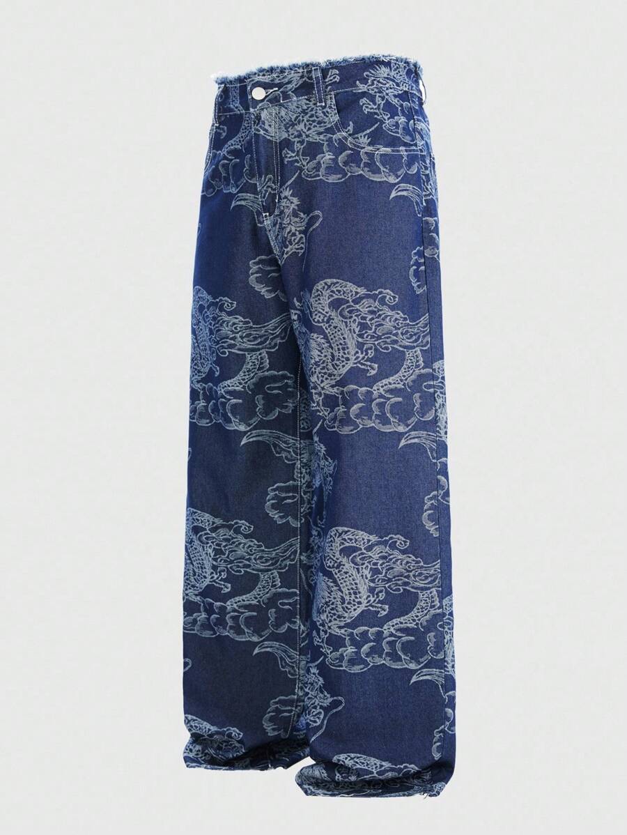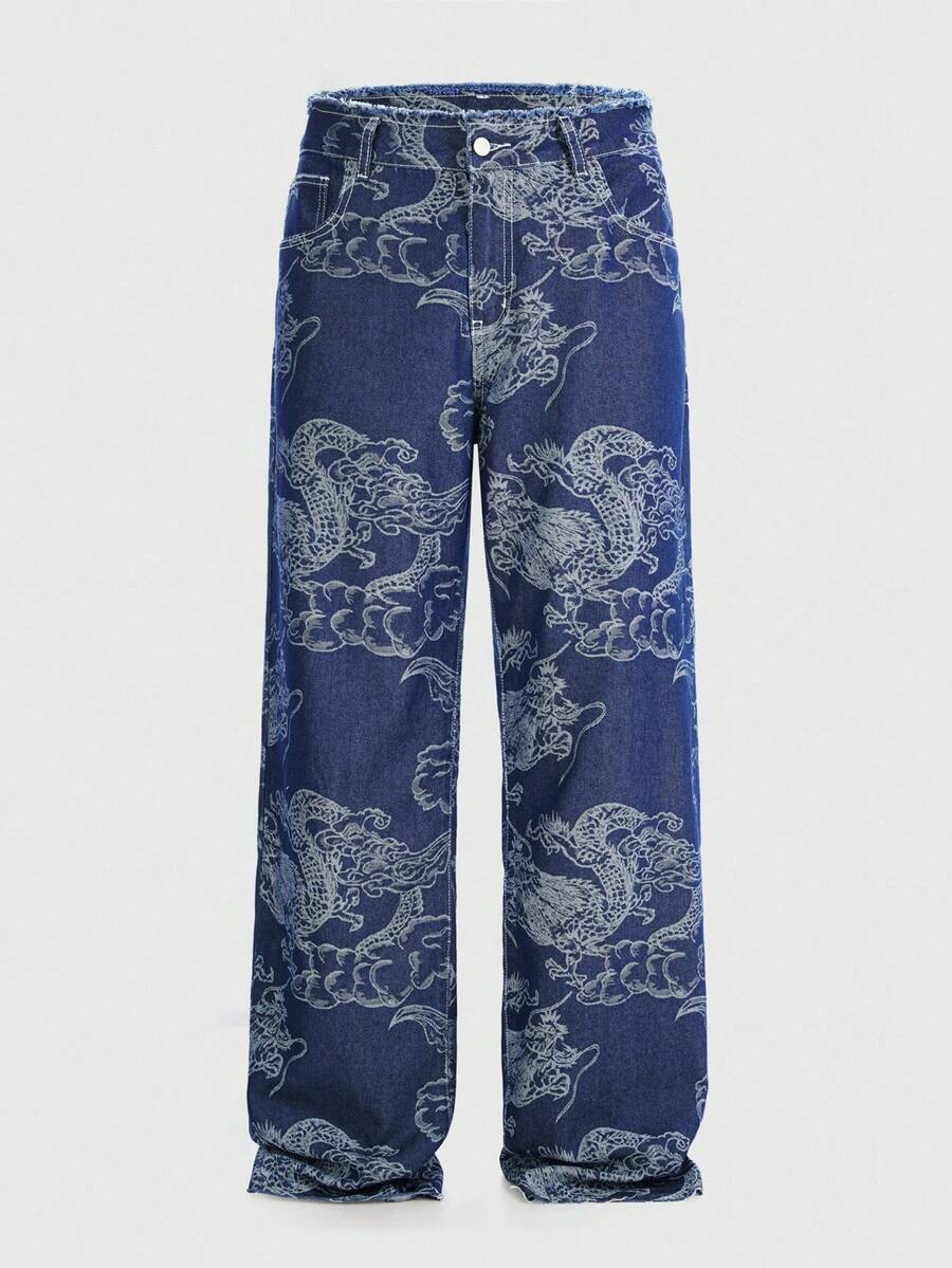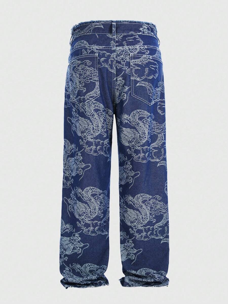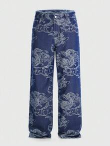 Anime Men's Casual Washed Dragon Print Straight Leg Jeans