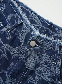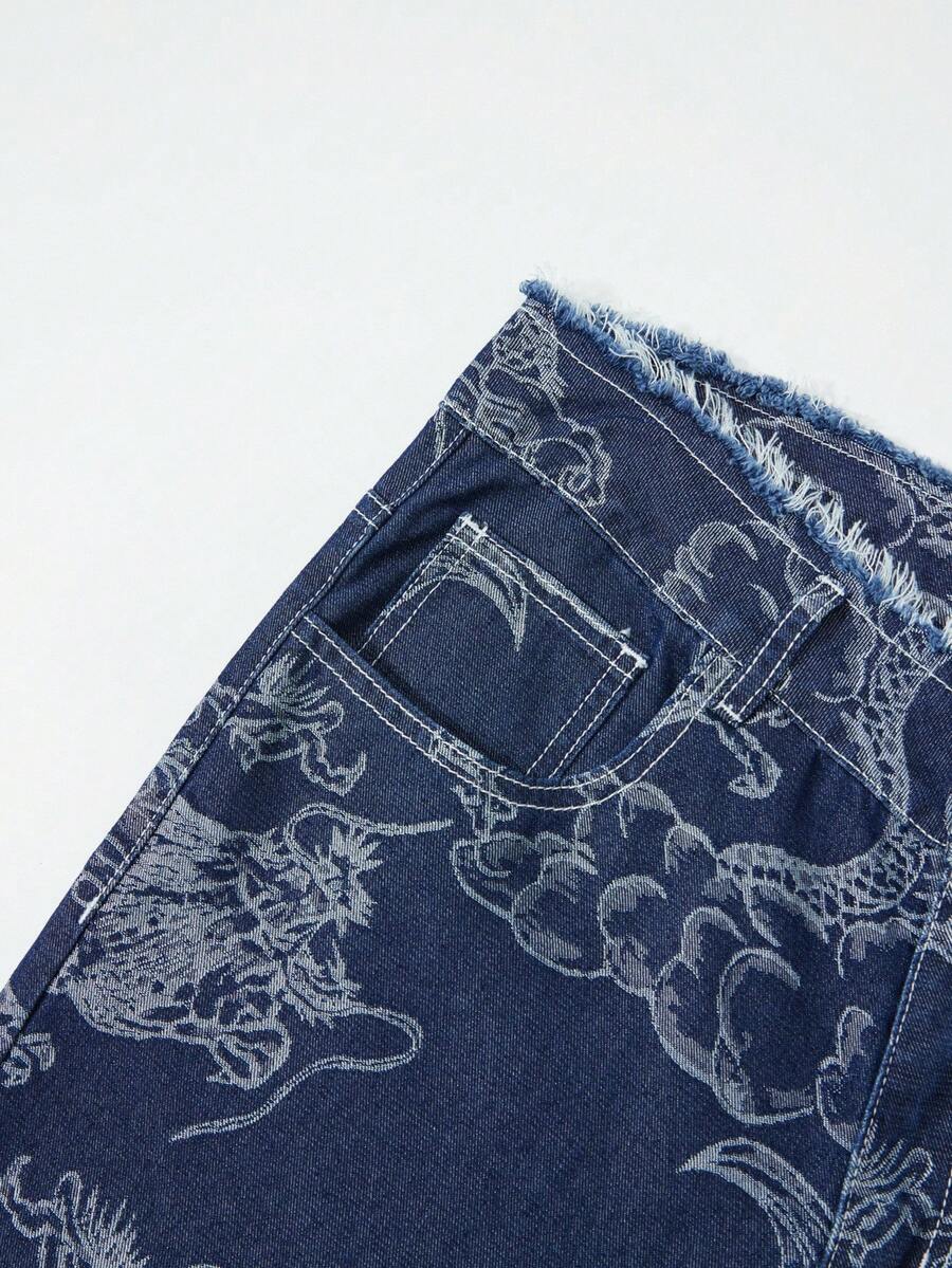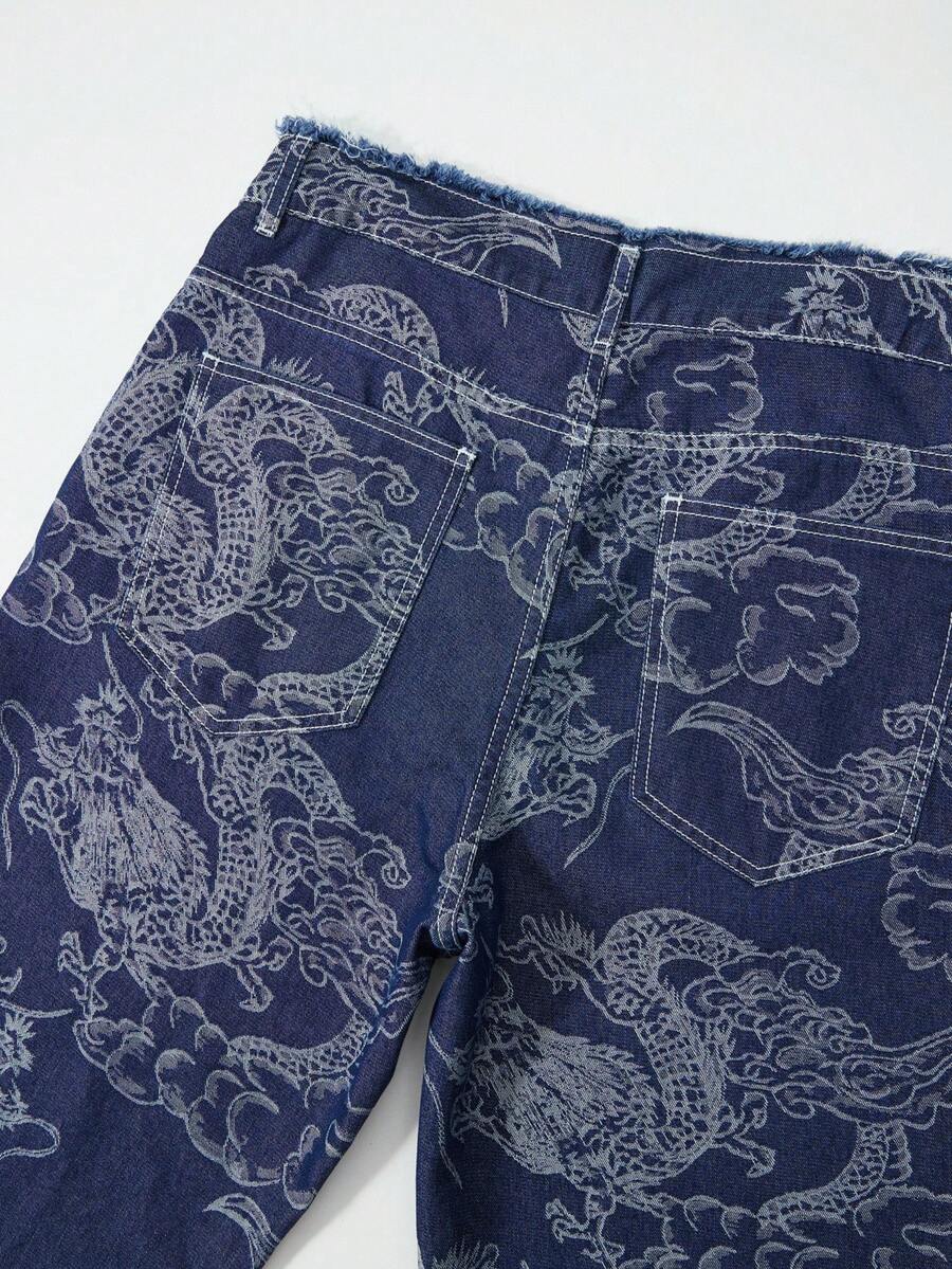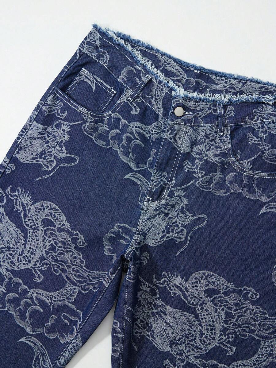 Anime Men's Casual Washed Dragon Print Straight Leg Jeans