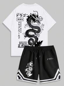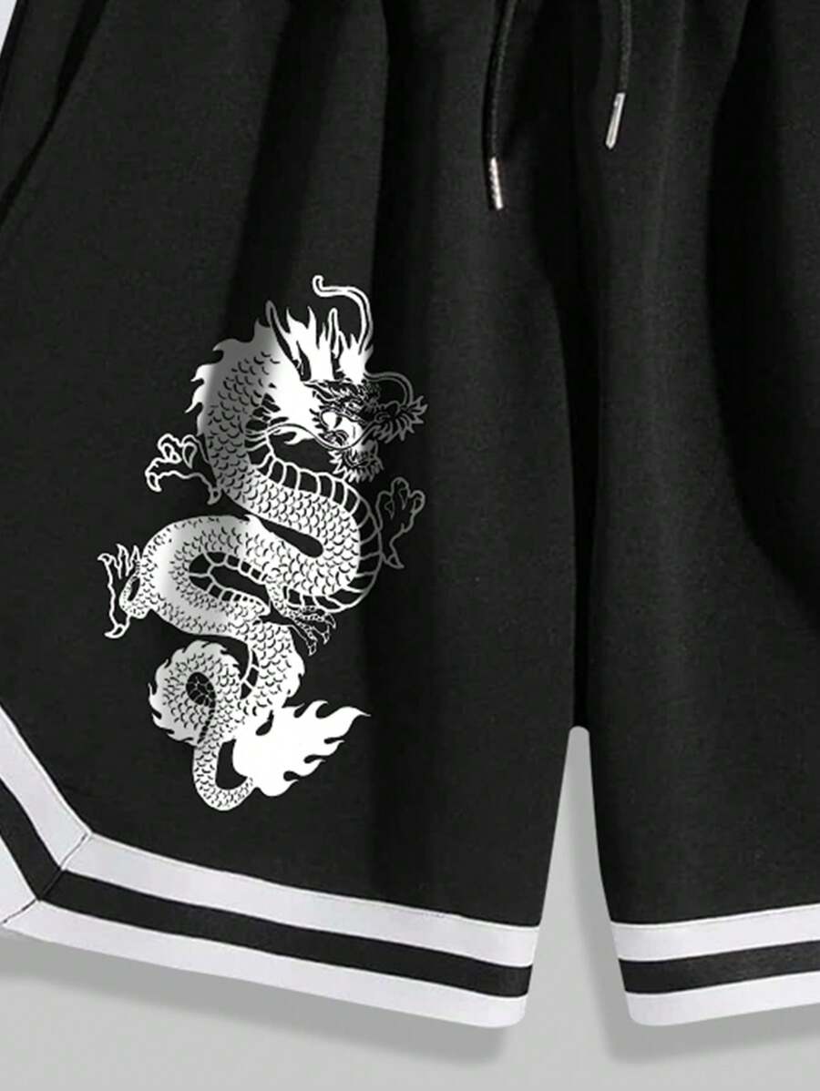 Anime Men's Chinese Dragon Printed Short Sleeve Basketball Jersey Style T-Shirt And Shorts Set, School