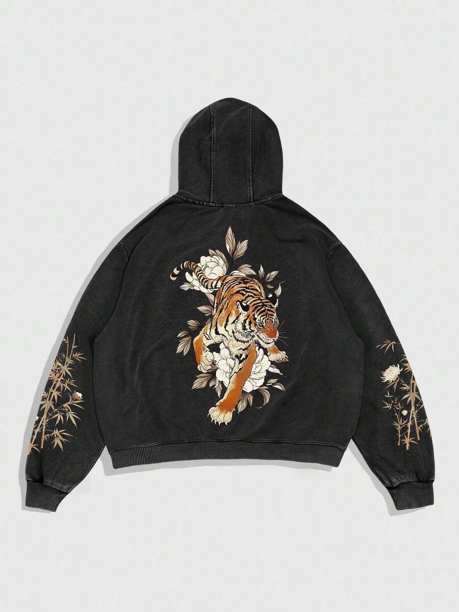 Street Life Men's Streetwear Casual Tiger Print Thermal Lined Pullover Sweatshirt, For Fall Winter