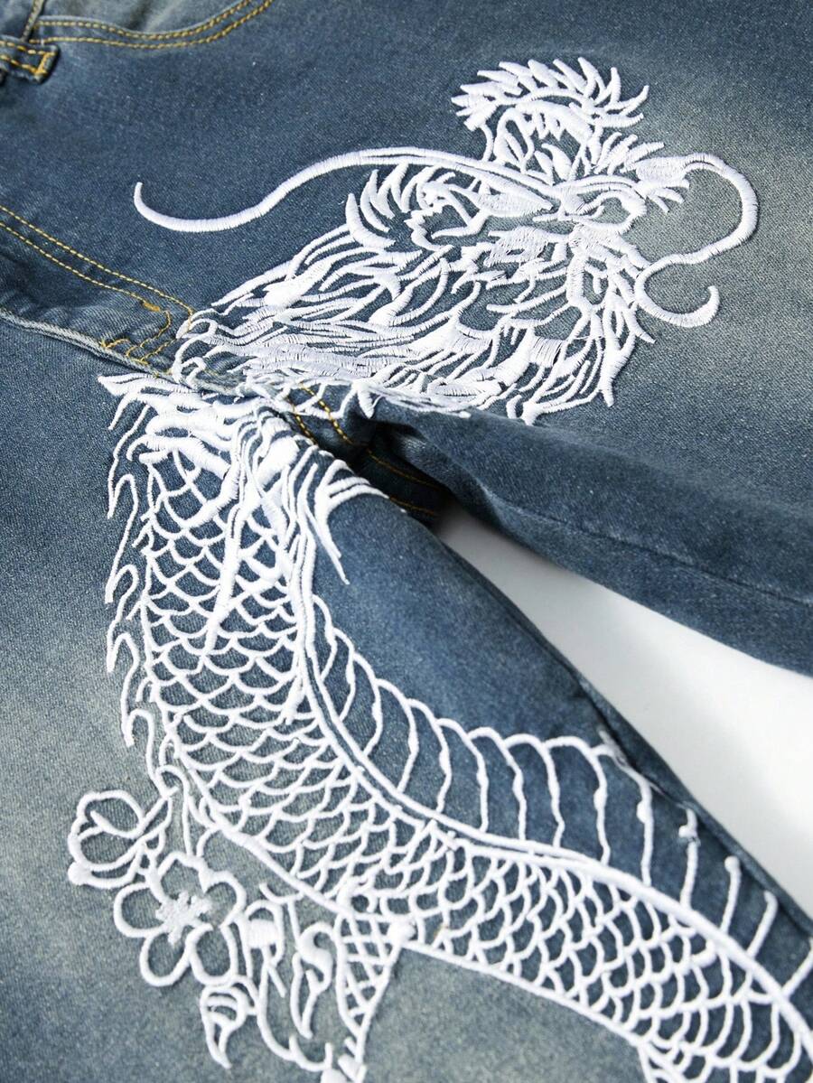 Anime Men's Washed Dragon Pattern Embroidered Denim Jeans