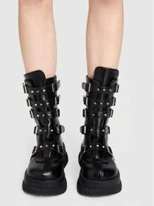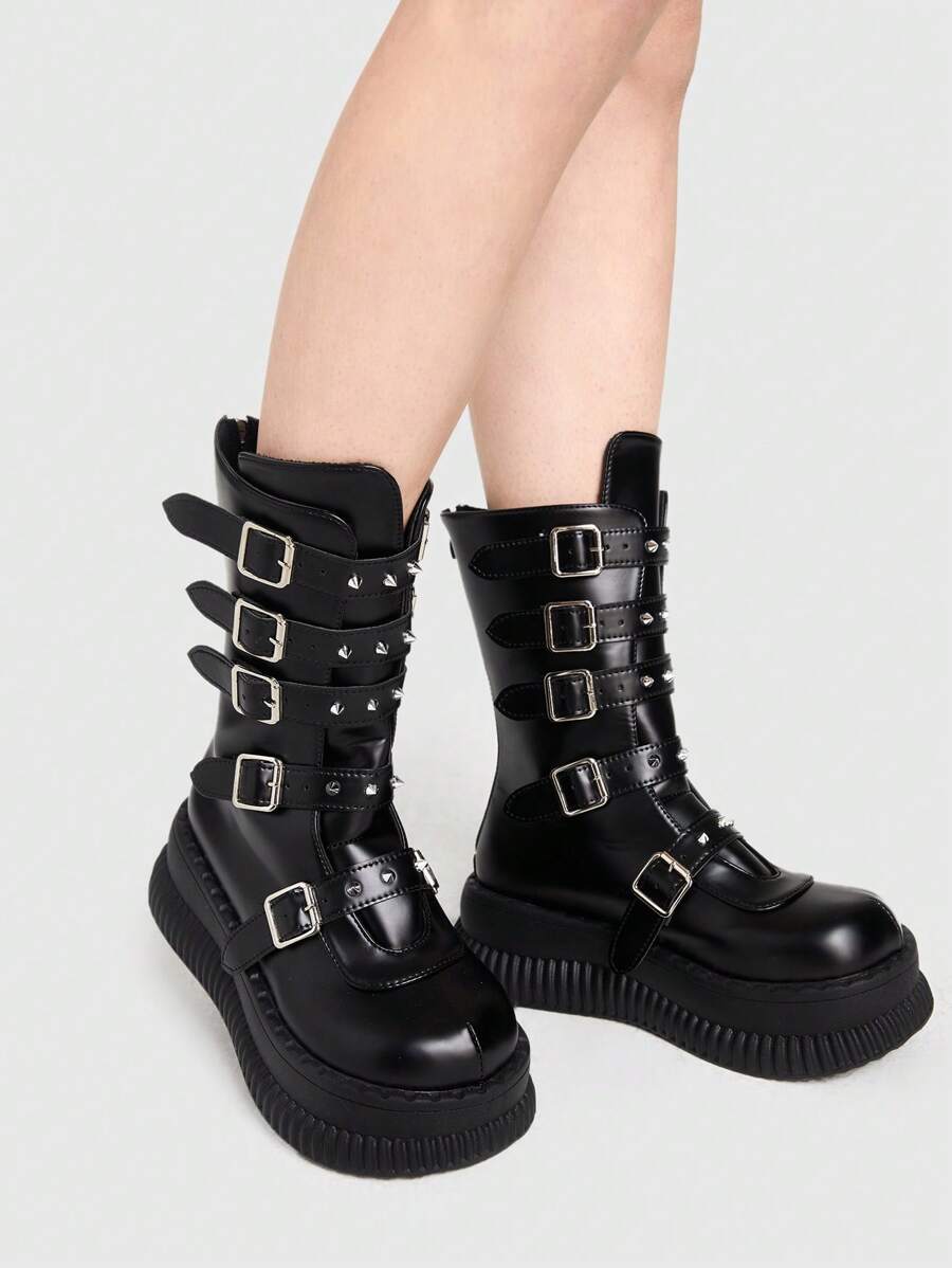 Anime Women Buckle & Spiked Decor Combat Boots, Punk Outdoor Fashion Boots