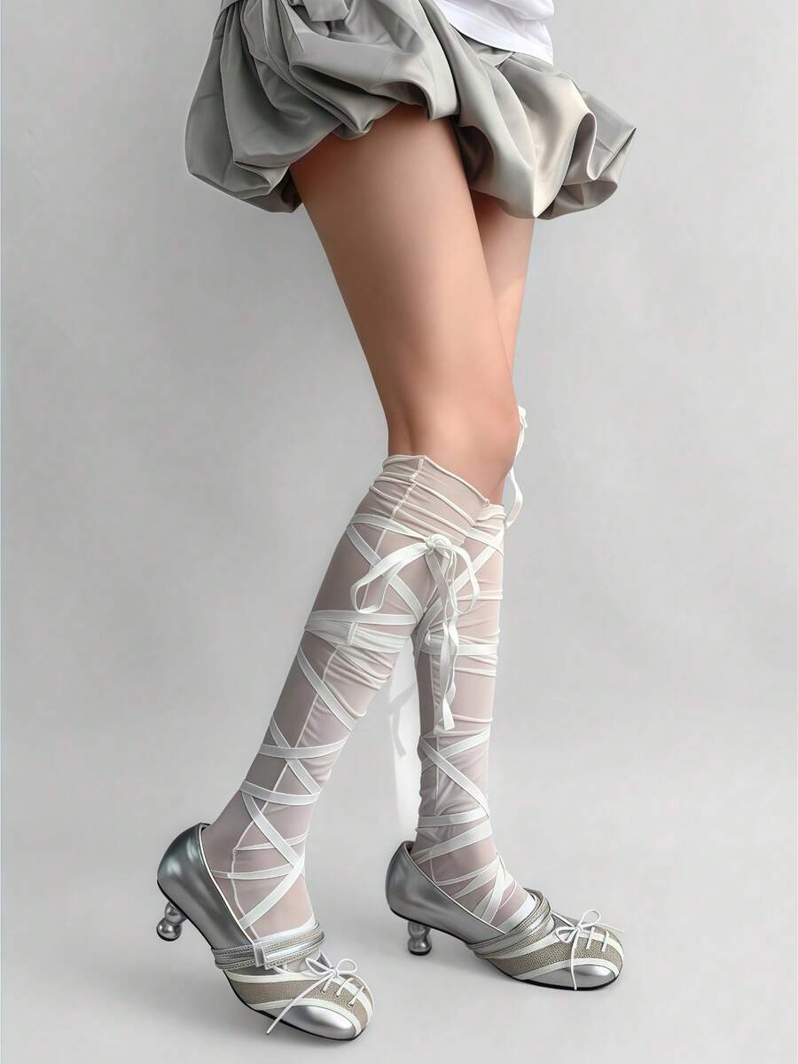 Anime Y2K Punk Style Asymmetrical Cross Tied Over-The-Knee Socks, Adjustable Solid Color Women Thigh High Stockings