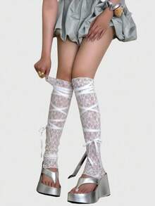 Anime Y2K Punk Style Asymmetrical Leg Socks With Criss-Cross Straps Over-The-Knee Socks, Solid Color Adjustable Women Long Tube Socks, Suitable For Outing, Dating, Campus, Music Festivals, Etc.