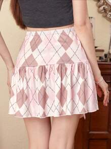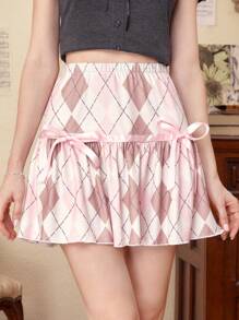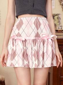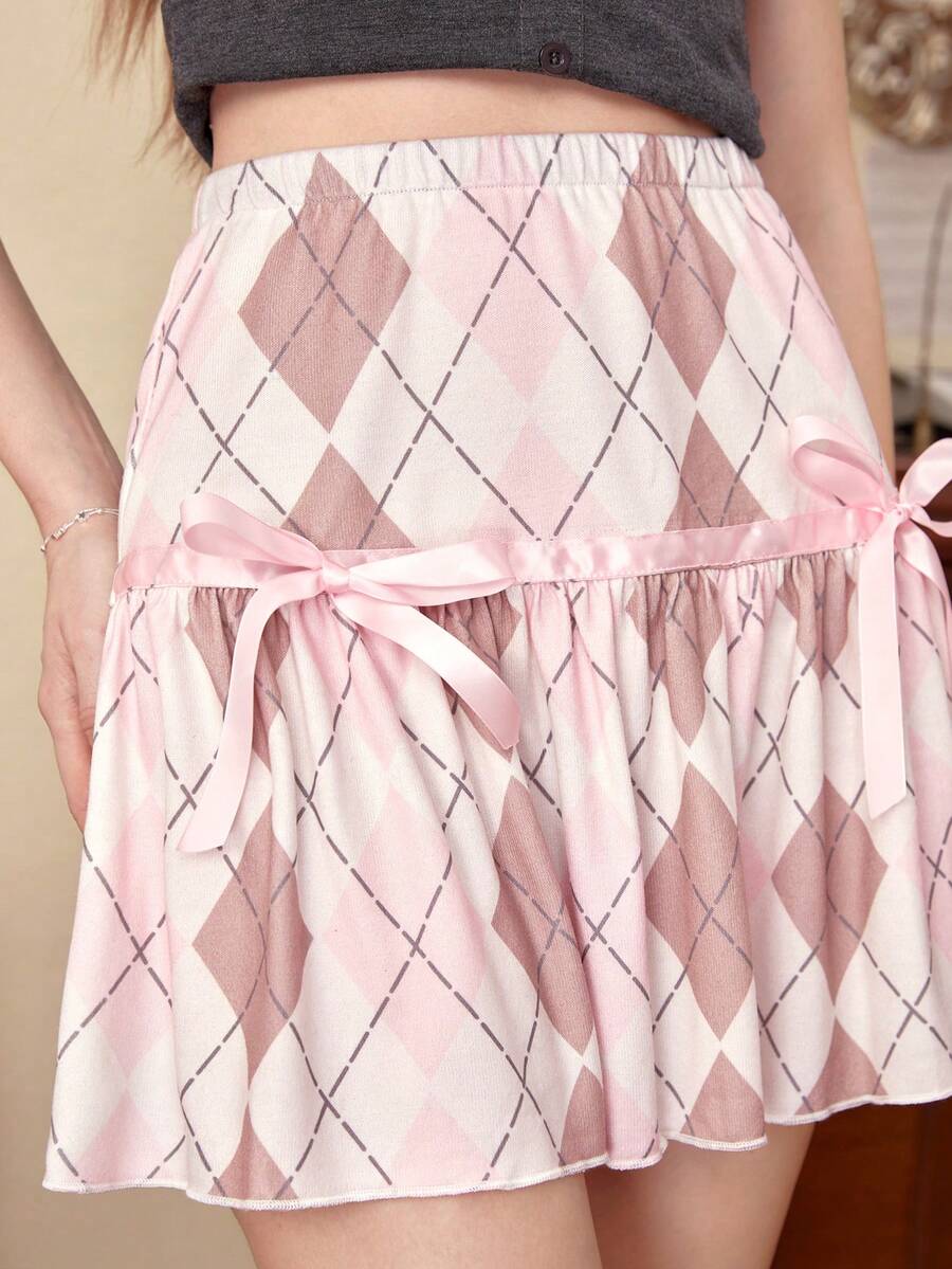 J-Fashion Argyle Print Bow Front Ruffle Hem Skirt