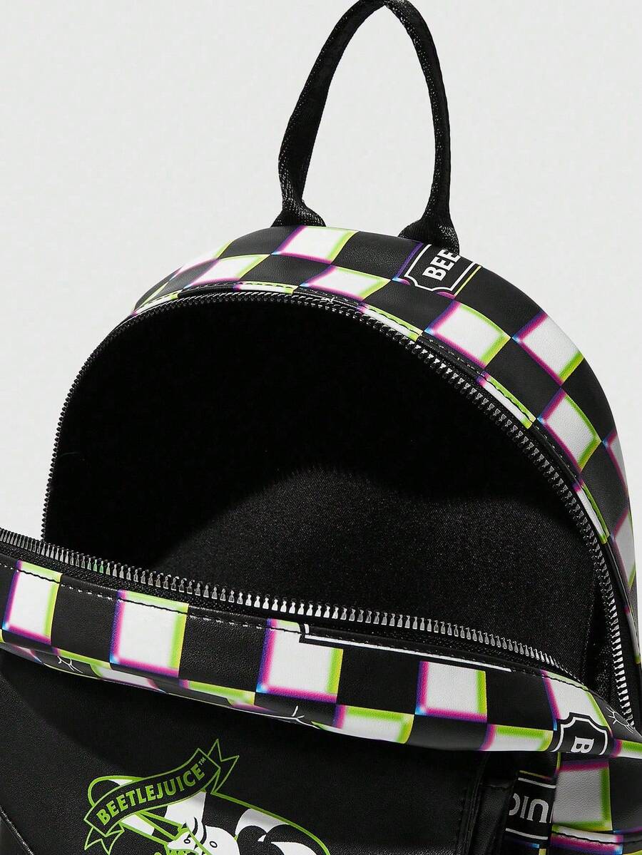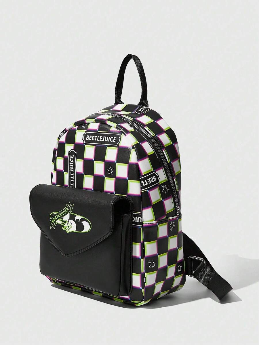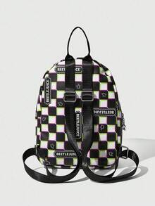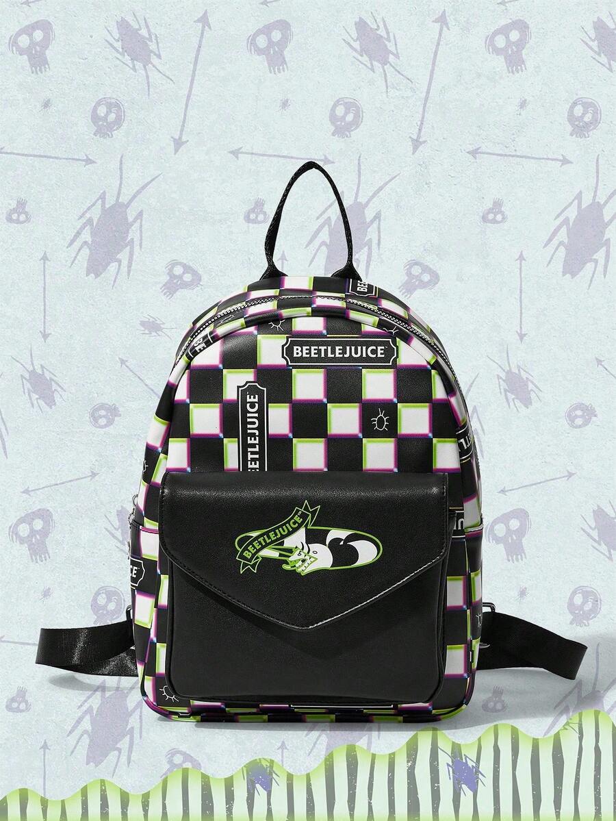 Beetlejuice | ROMWE Checkered & Letter Pattern Punk Backpack, Fashionable For Commuting And Versatile