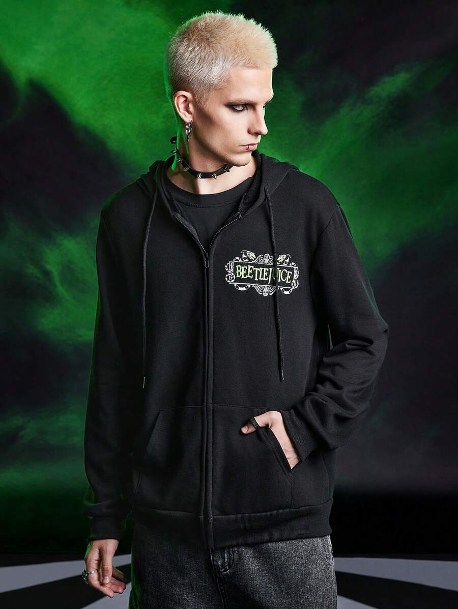 Beetlejuice | ROMWE Men's Street Dark Style Letter & Insect Print Dropped Shoulder Loose Zip-Up Hoodie With Drawstring, Spring/Autumn