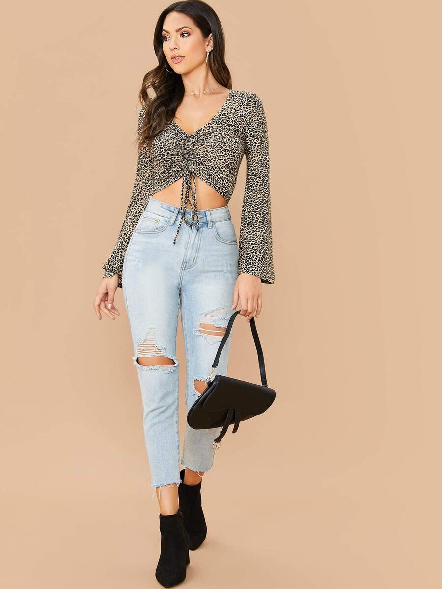 Bell Sleeve Ruched Drawstring Front Leopard Top