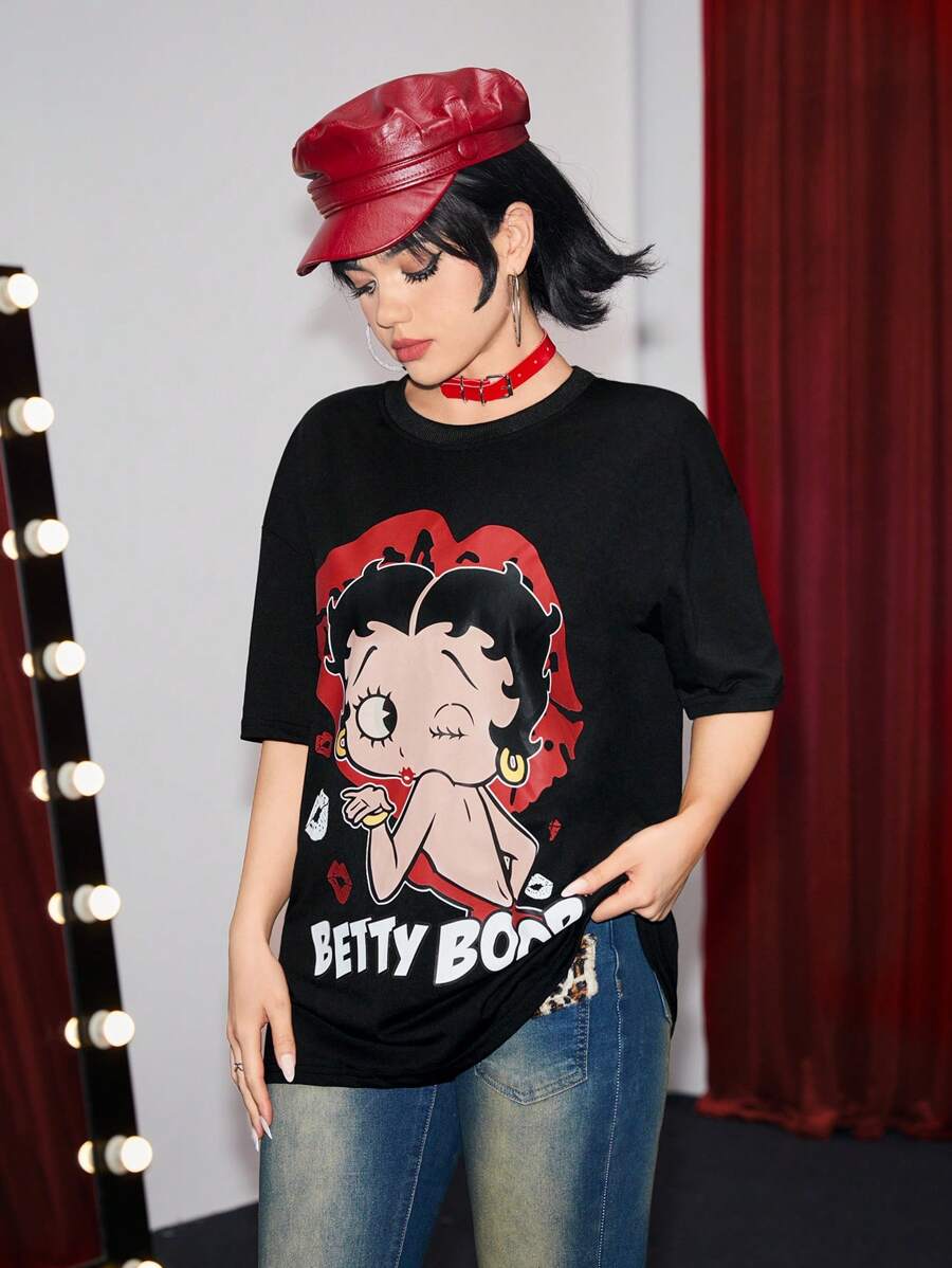Betty Boop | ROMWE Casual Cartoon Character And Letter Printed Loose Oversized T-Shirt For Summer
