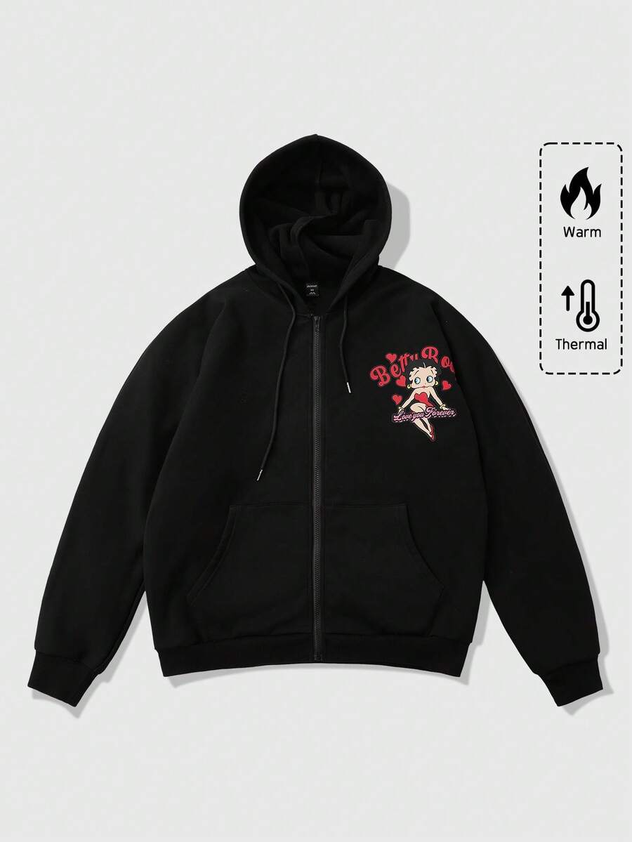 Betty Boop | ROMWE Men's Zipper Hoodie With Street American Design, Batwing Sleeve, Cartoon Figure & Letter Graphic , Fall Winter