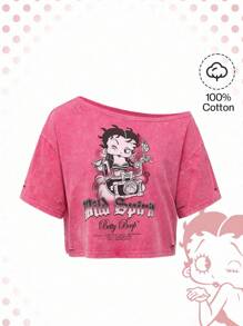 Betty Boop | ROMWE Women's Asymmetric Neckline Ripped Cropped Cartoon Figure Graphic Washed Tee