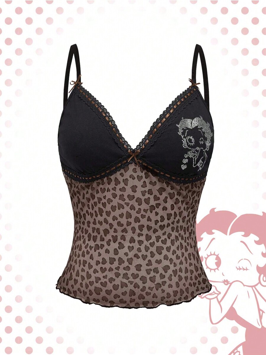 Betty Boop | ROMWE Women's Summer Contrast Lace Lettuce Hem Rhinestone Figure Pattern Camisole Top