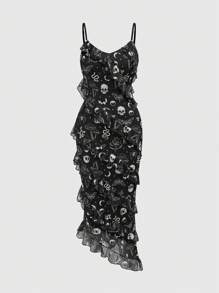 Black Ruffle Hem Asymmetrical Slip Dress, Party Cocktail Formal Dress For Women Women's Concert Costumes, Rave Costumes, Carnival Costumes, Country Concert Costumes,Summer Outfits For Women
