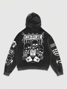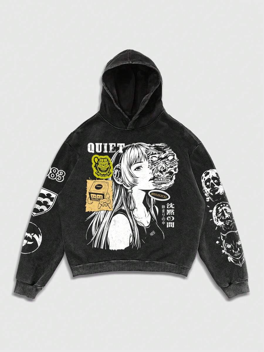 Black Snowflake Print Anime Hooded Sweatshirt For Men, No Pockets