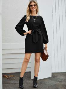 Boat Neck Bishop Sleeve Belted Dress
