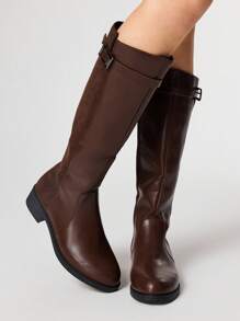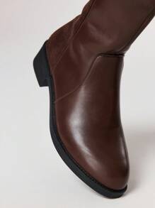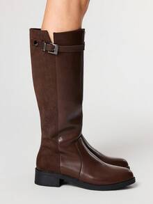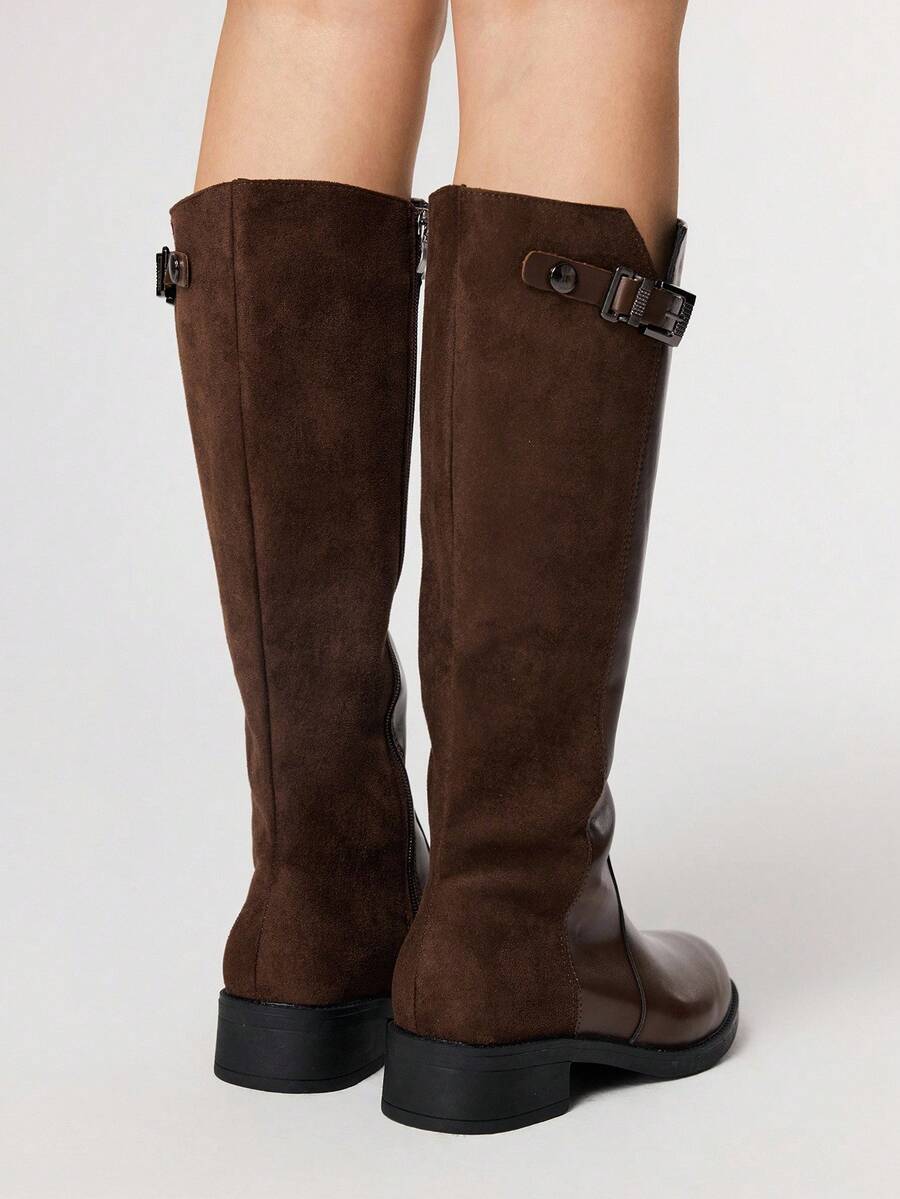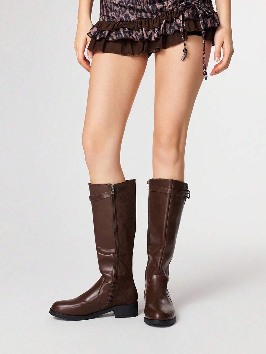 Fairycore Brown Leather Tall Boots With Side Zipper, Flat Bottom Motorcycle Riding Boots For Women, Mid-Calf Boots
