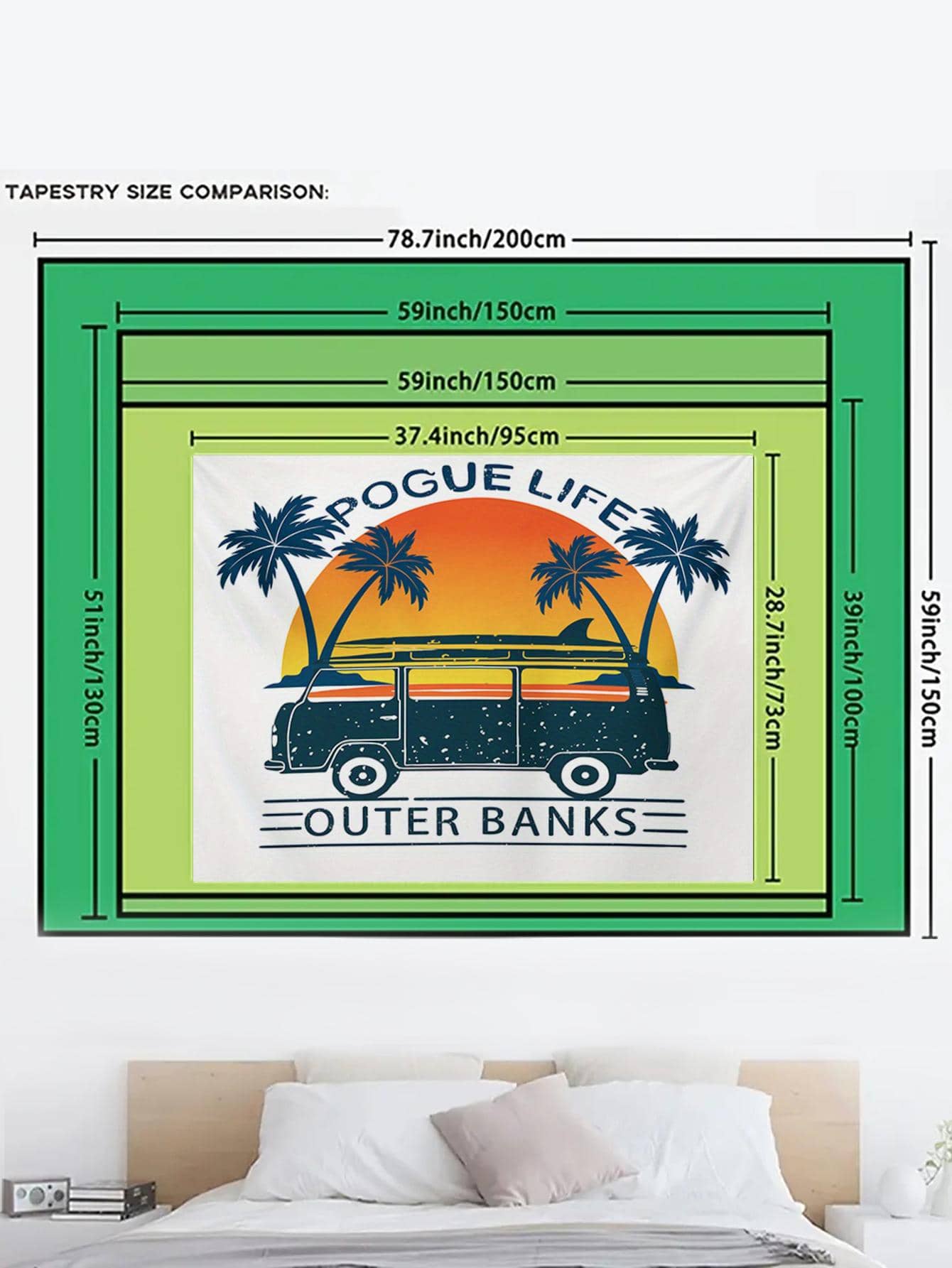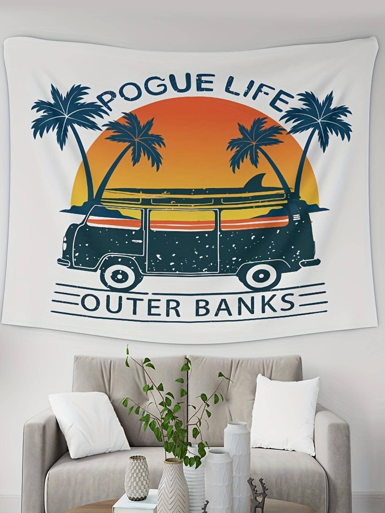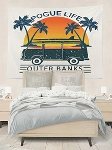 Bus & Palm Tree Print Tapestry, Flannelette Hanging Wall Decoration, For Home Decor