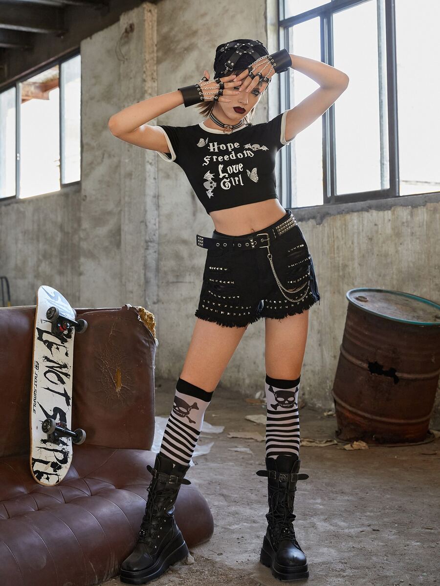 Butterfly & Slogan Graphic Contrast Binding Crop Tee