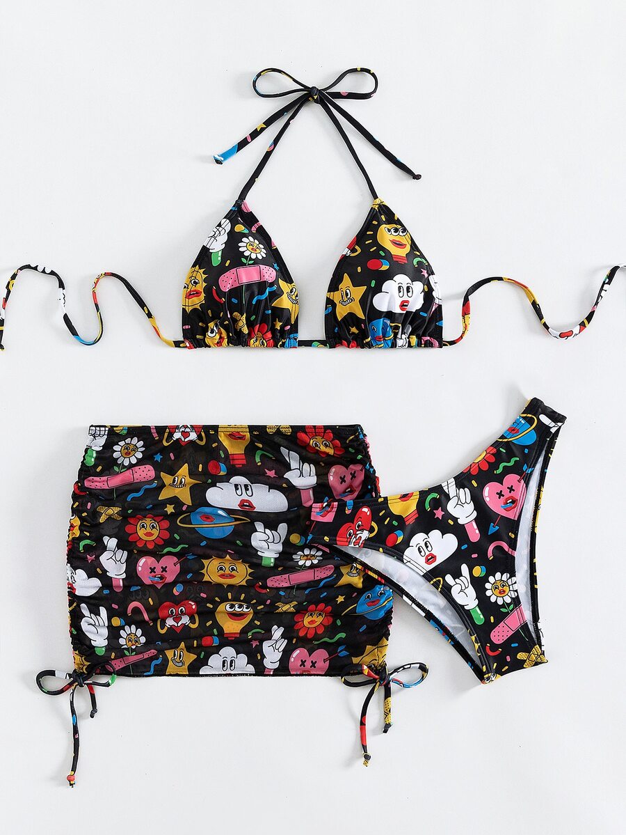 Cartoon Graphic Bikini Set Halter Triangle Bra & Bikini Bottom & Cover Up Skirt 3 Piece Bathing Suit