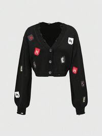 Street Life Y2K Streetwear Style Letter Applique Embroidery Distressed Button Front Women Knit Cardigan