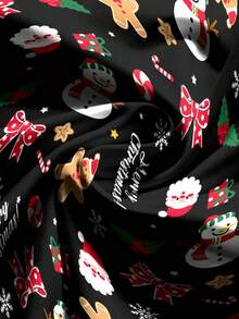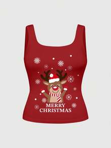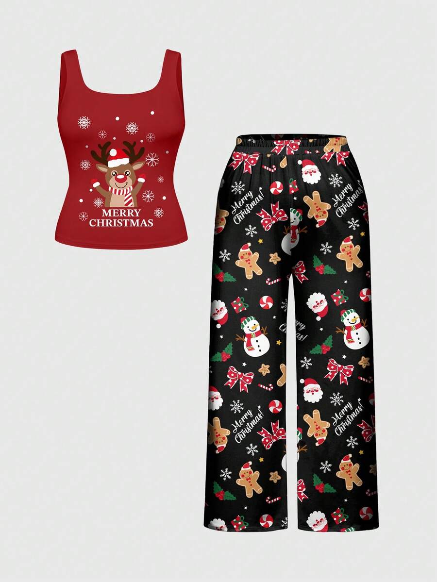 Christmas Cartoon Snowman, Santa Claus, Reindeer, Snowflake, Bow Print Plus Size Full Graphic Tank Top And Pants Pajama Set, Casual Sleepwear