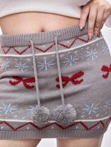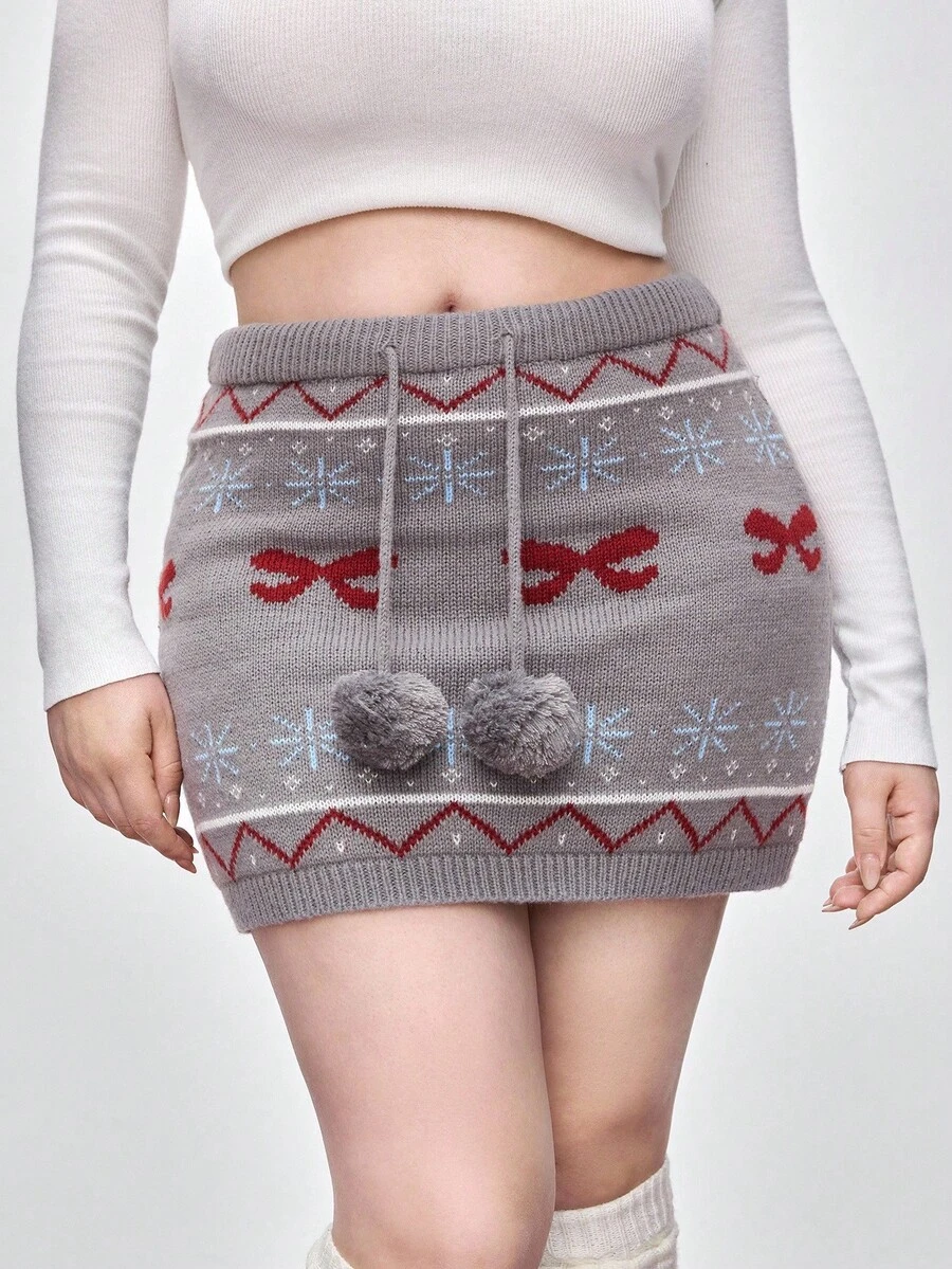 Kawaii Christmas Colorblock Bow & Pom Pom Decor Plus Size Women Knitted A-Line Skirt, Autumn/Winter