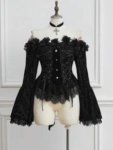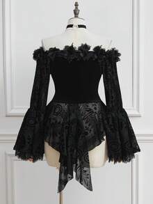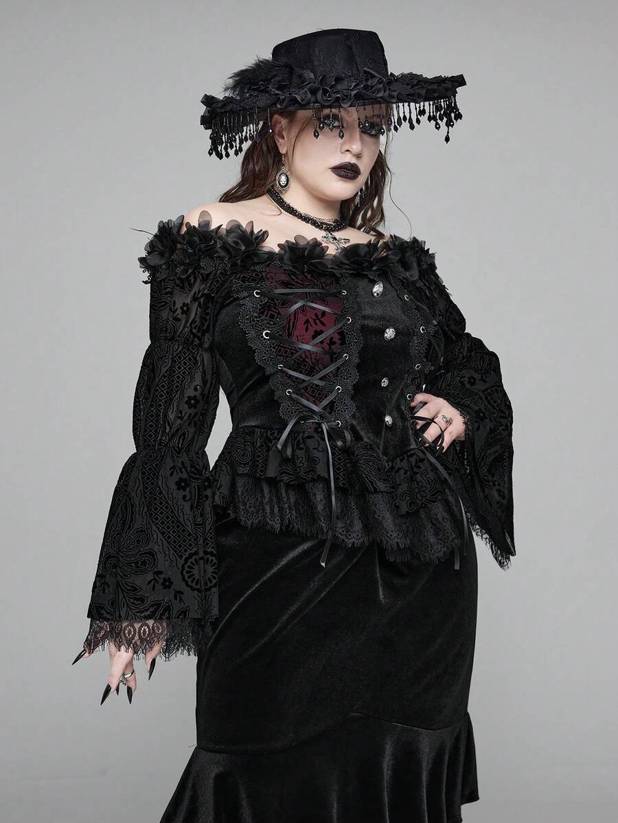 Goth Christmas Plus Size Gothic Elegant Lace Velvet Collar Embellished Floral Tie Blouse, Autumn/Winter Red & Black Gothic Style Luxurious Embroidered Formal Top, Plus Size Women Autumn Apparel, Plus Size Holiday Dress