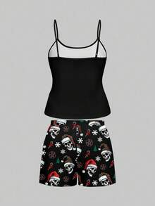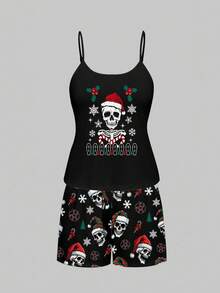 Goth Christmas Tree, Skull, Snowflake Candy Cane, Skull Santa Hat, Snowflake Plus Size All-Over Print Camisole Shorts Pajama Set, Casual Sleepwear