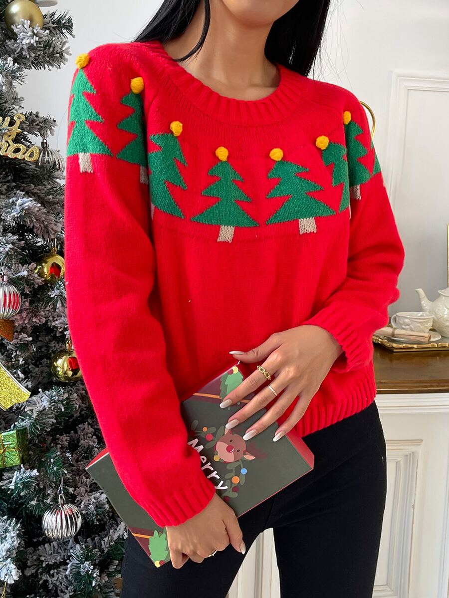 Christmas Tree Pattern Pom Pom Detail Raglan Sleeve Sweater