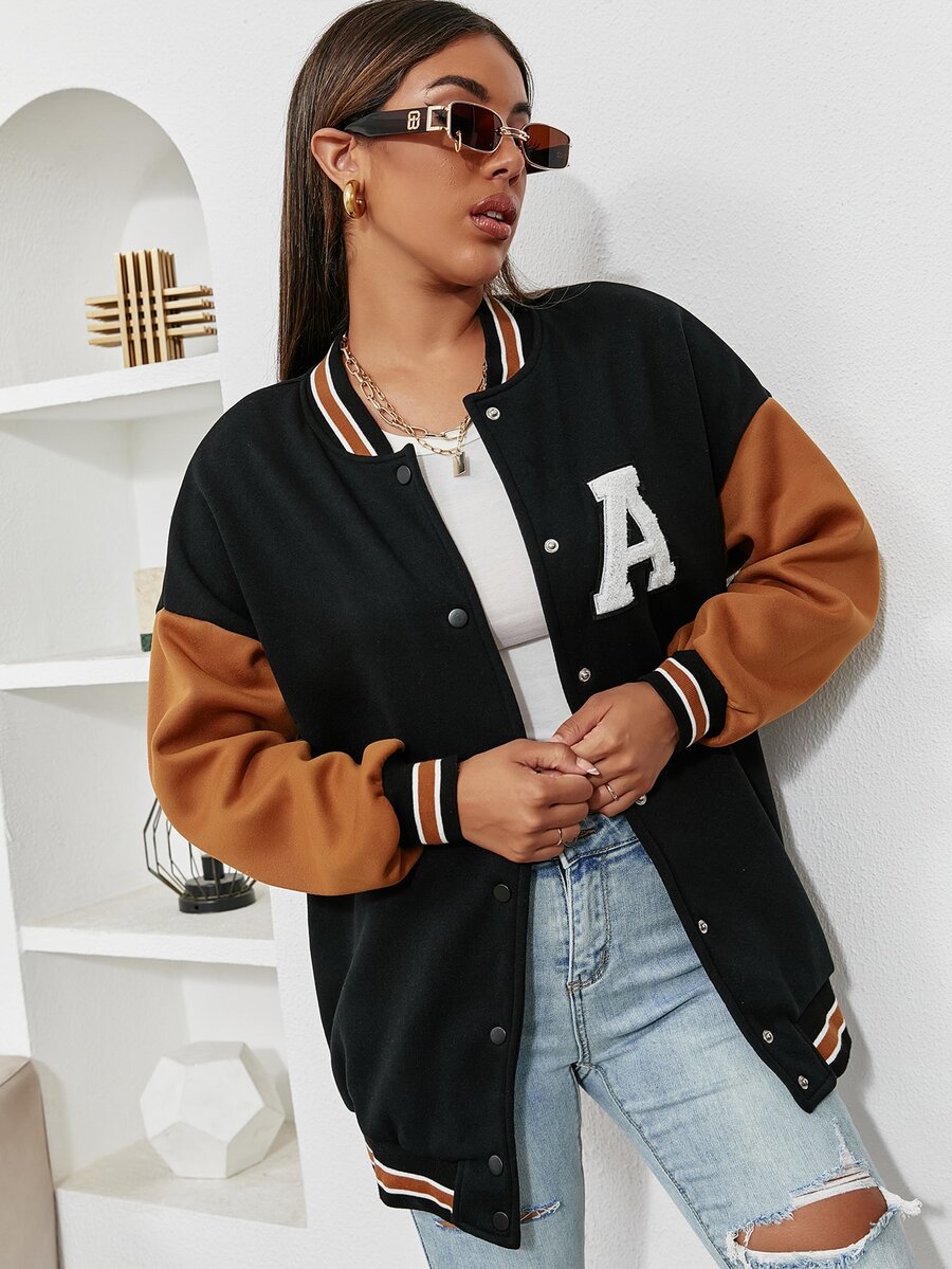 Colorblock Letter Patched Drop Shoulder Varsity Jacket
