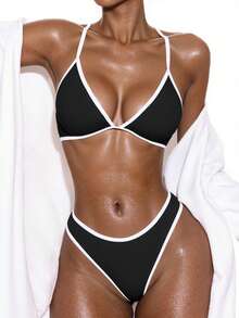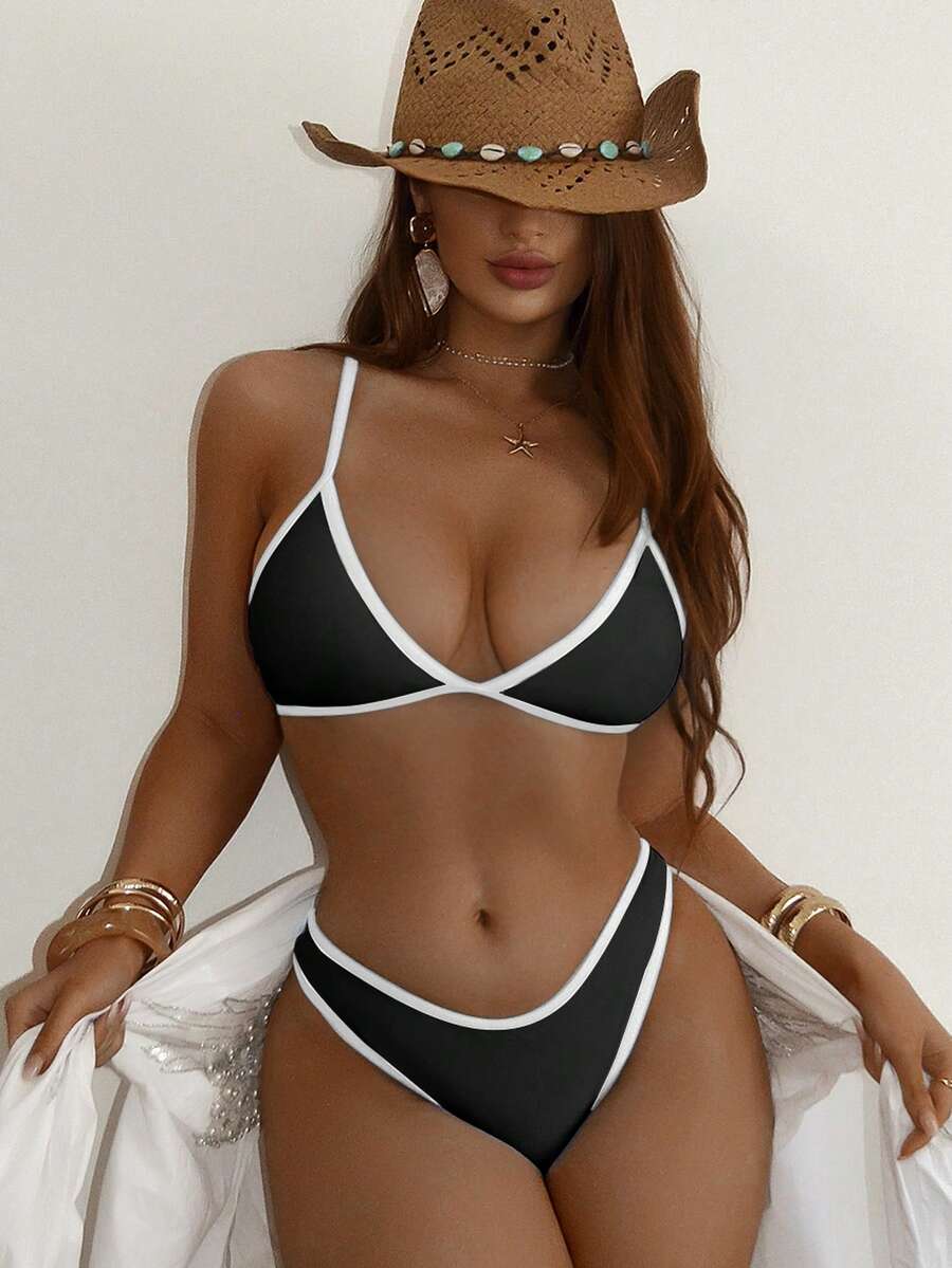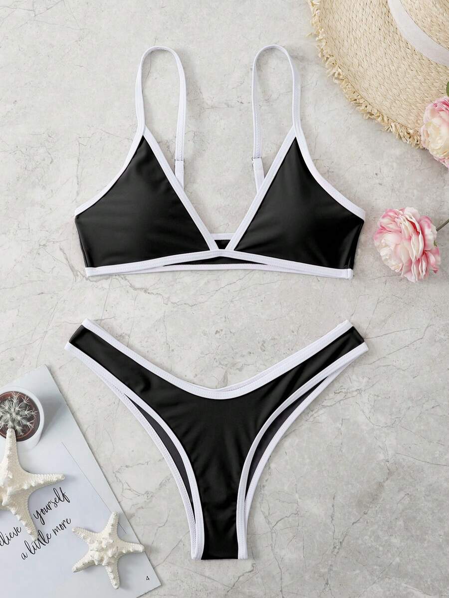 Contrast Color Trim Spaghetti Strap Fashionable Summer Beach Bikini Swimsuit
