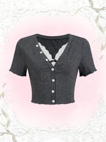 Contrast Lace Button Front Lettuce Trim Crop Tee