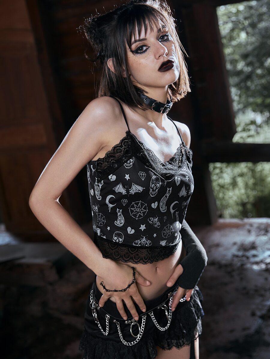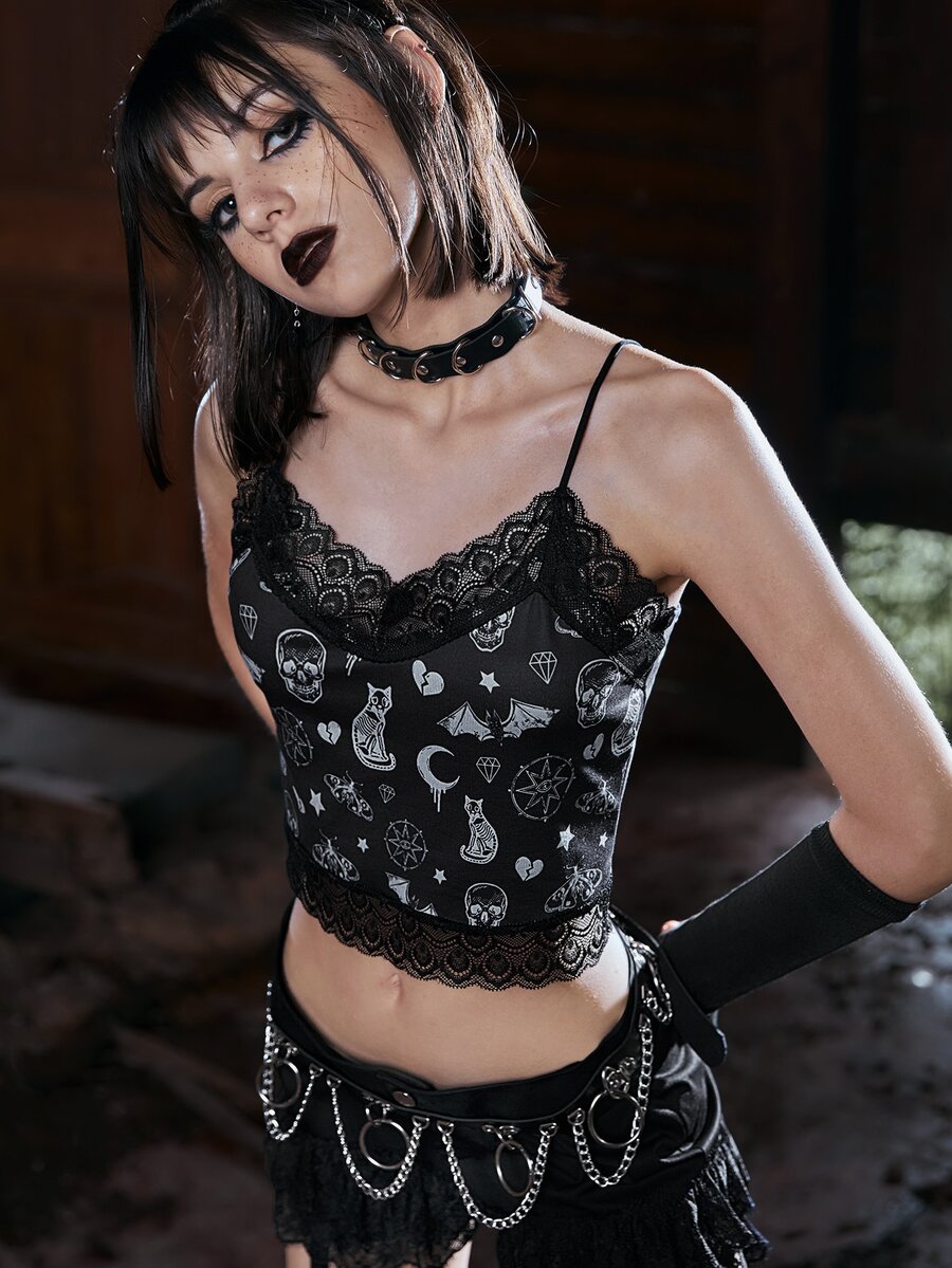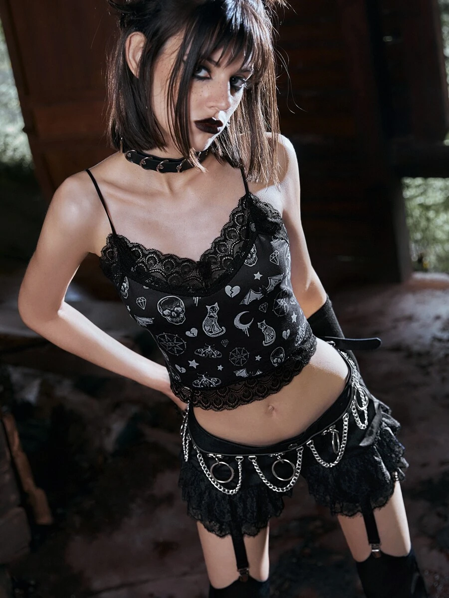 Contrast Lace Skull & Bats Graphic Crop Cami