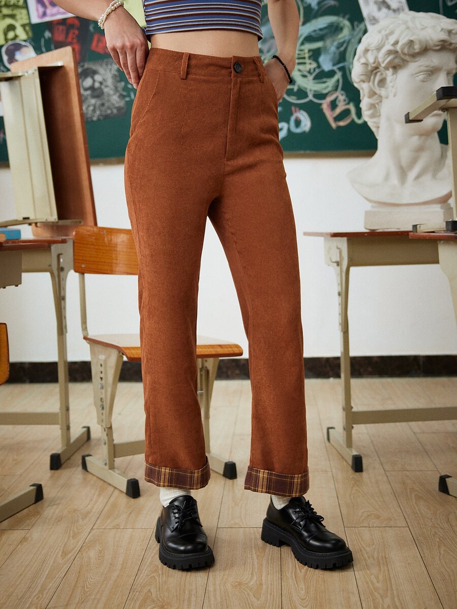 Contrast Plaid Corduroy Pants