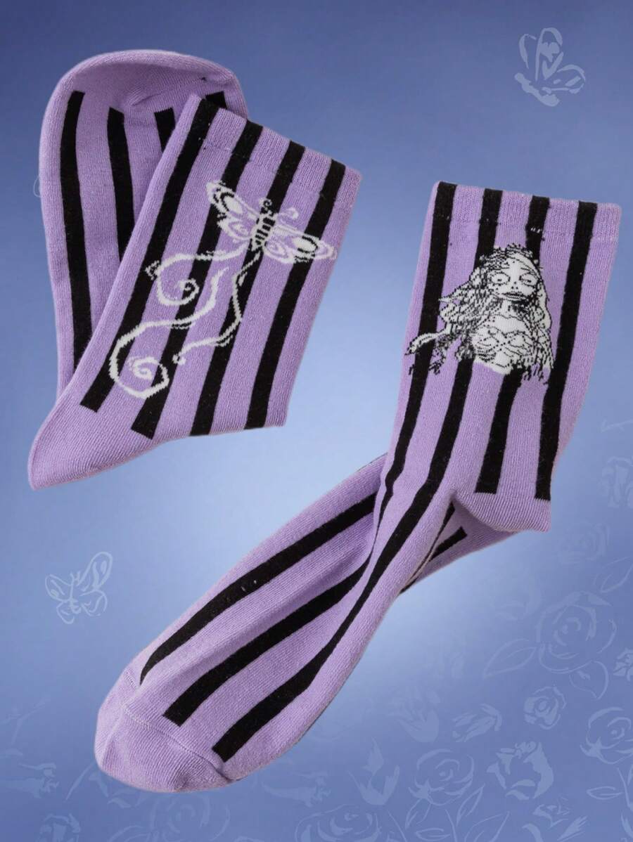 Corpse Bride | ROMWE 1pair Women Striped Butterfly & Ghost Pattern Crew Socks