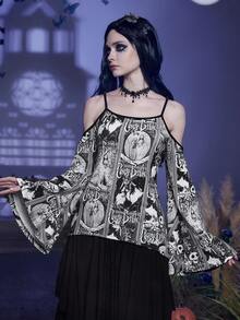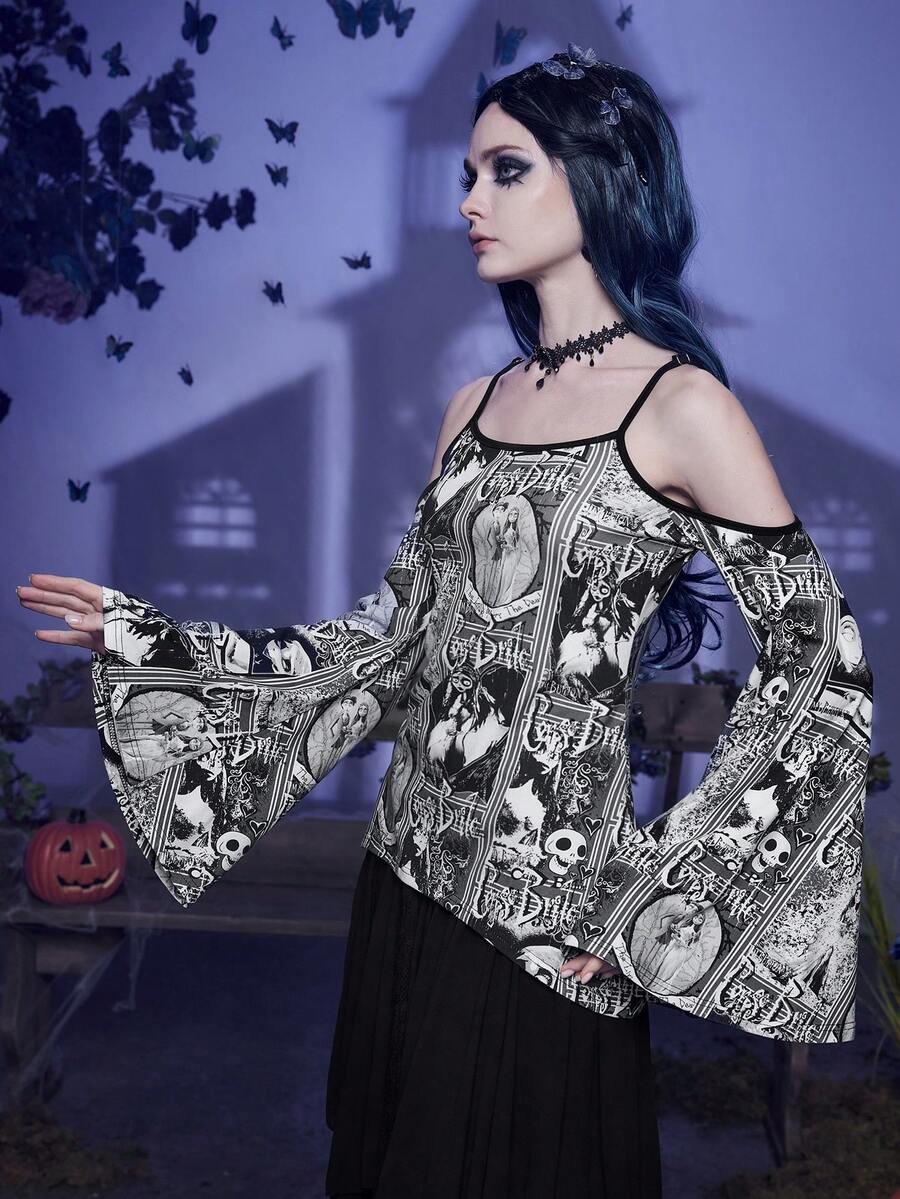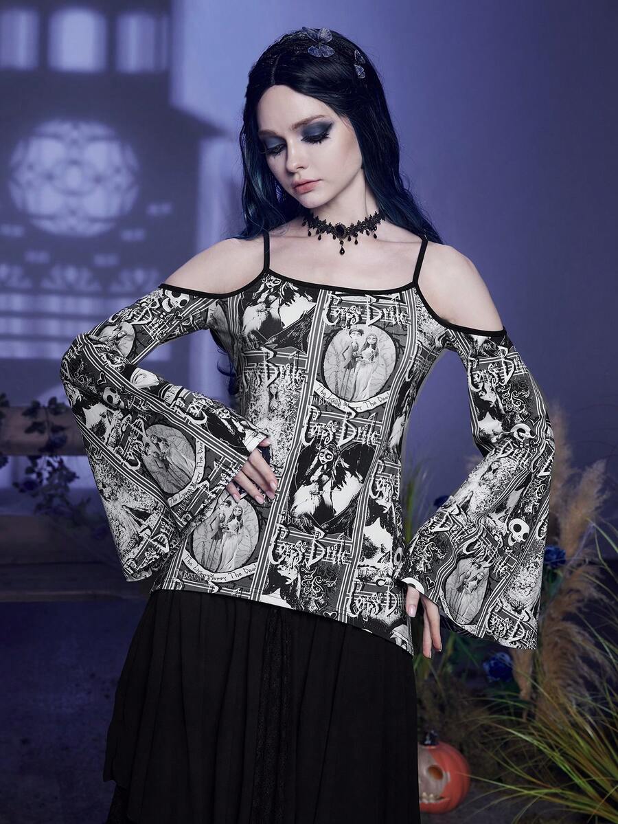Corpse Bride | ROMWE Figure & Letter Graphic Cold Shoulder Trumpet Sleeve Tee