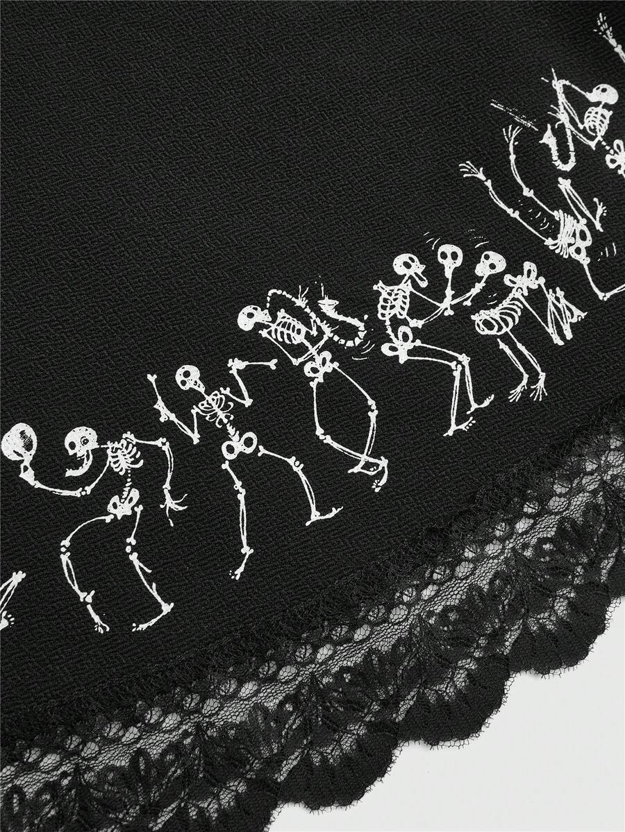 Corpse Bride | ROMWE Women's Black Contrast Lace Skeleton Print Tie Neck Dress With Cut Out Design, Suitable For Halloween