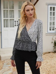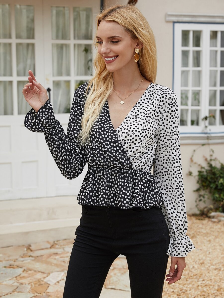 Daisy Floral Surplice Ruffle Hem Spliced Blouse