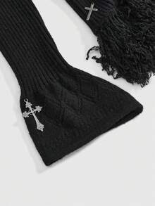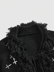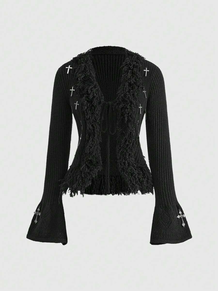 Goth Dark Autumn/Winter Versatile Waist Cinched Tassel Cross Decor Fitted Cardigan For Women