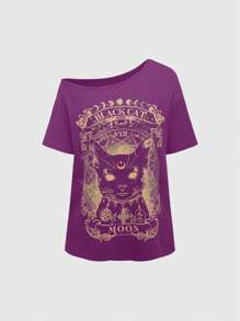 Dark Gothic Black Cat Mysterious Loose Drop Shoulder Short Sleeve T-Shirt