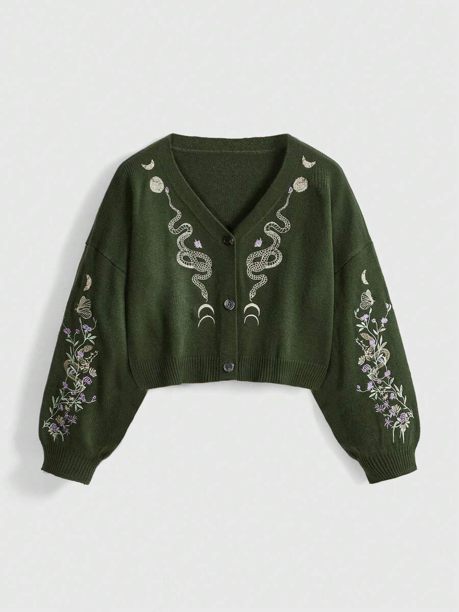 Dark Gothic Snake Skin Embroidery Plus Size Cardigan Sweater, Olive Green Women Cardigan Sweater