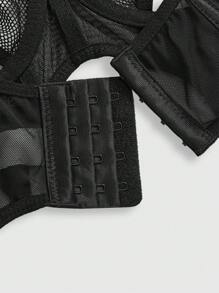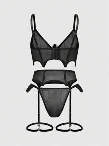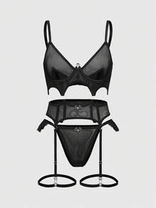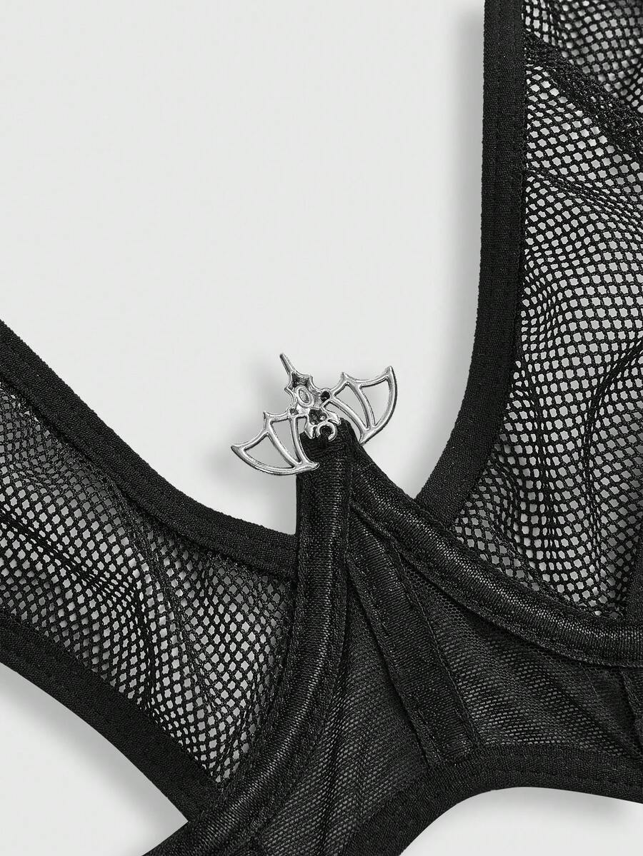 Dark Gothic Style Bats Decor Mesh Underwire Bra And Thong Garter Belt Sexy Lingerie Set, Halloween